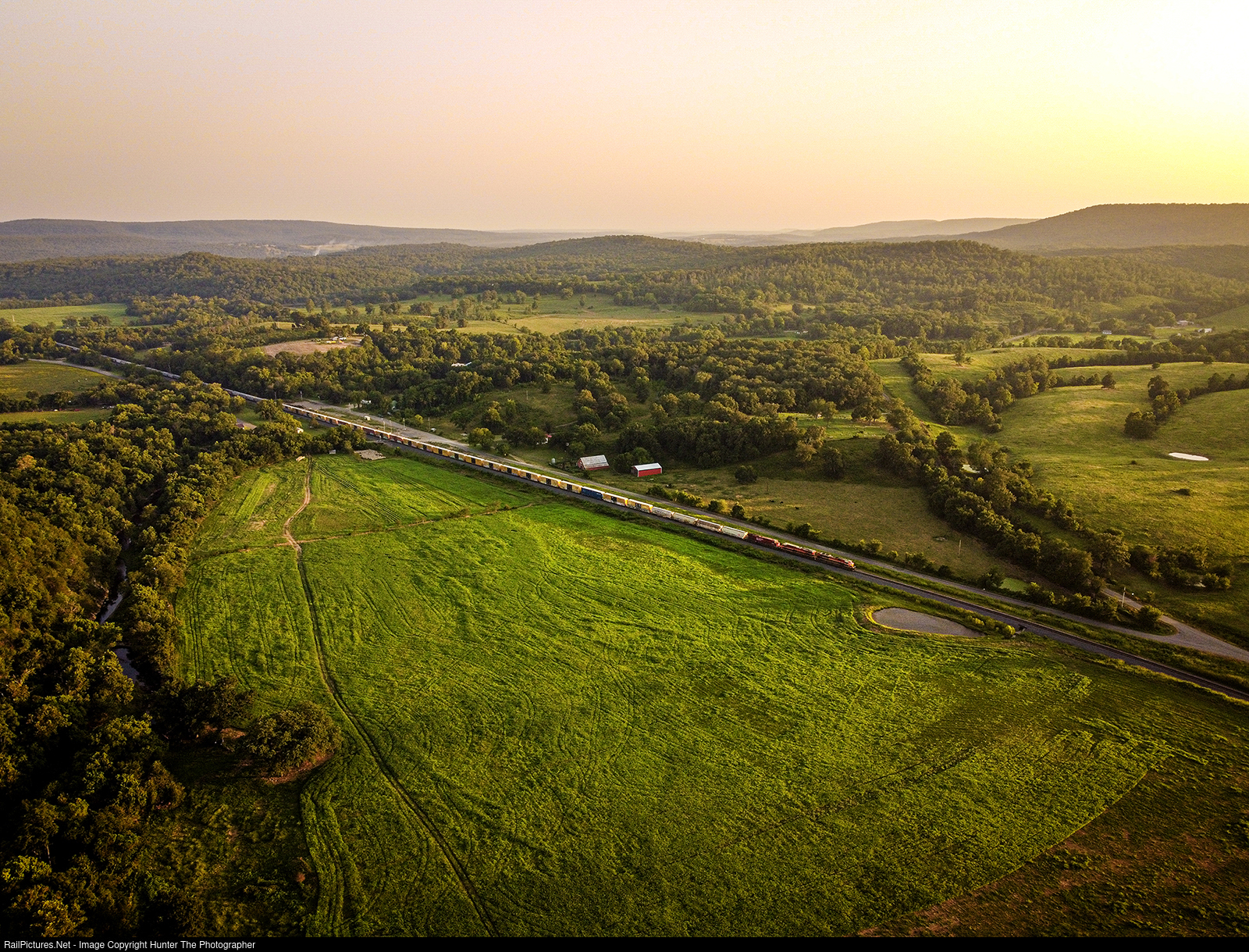 Sooner State Summer Sunset | As the sun approaches the horizon at the end of a hot Sunday, July 30, 2023, northbound CPKC train G387 cruises past the community of Bunch, OK. Though officially an empty grain train, there was a large cut of boxcars near the head end.