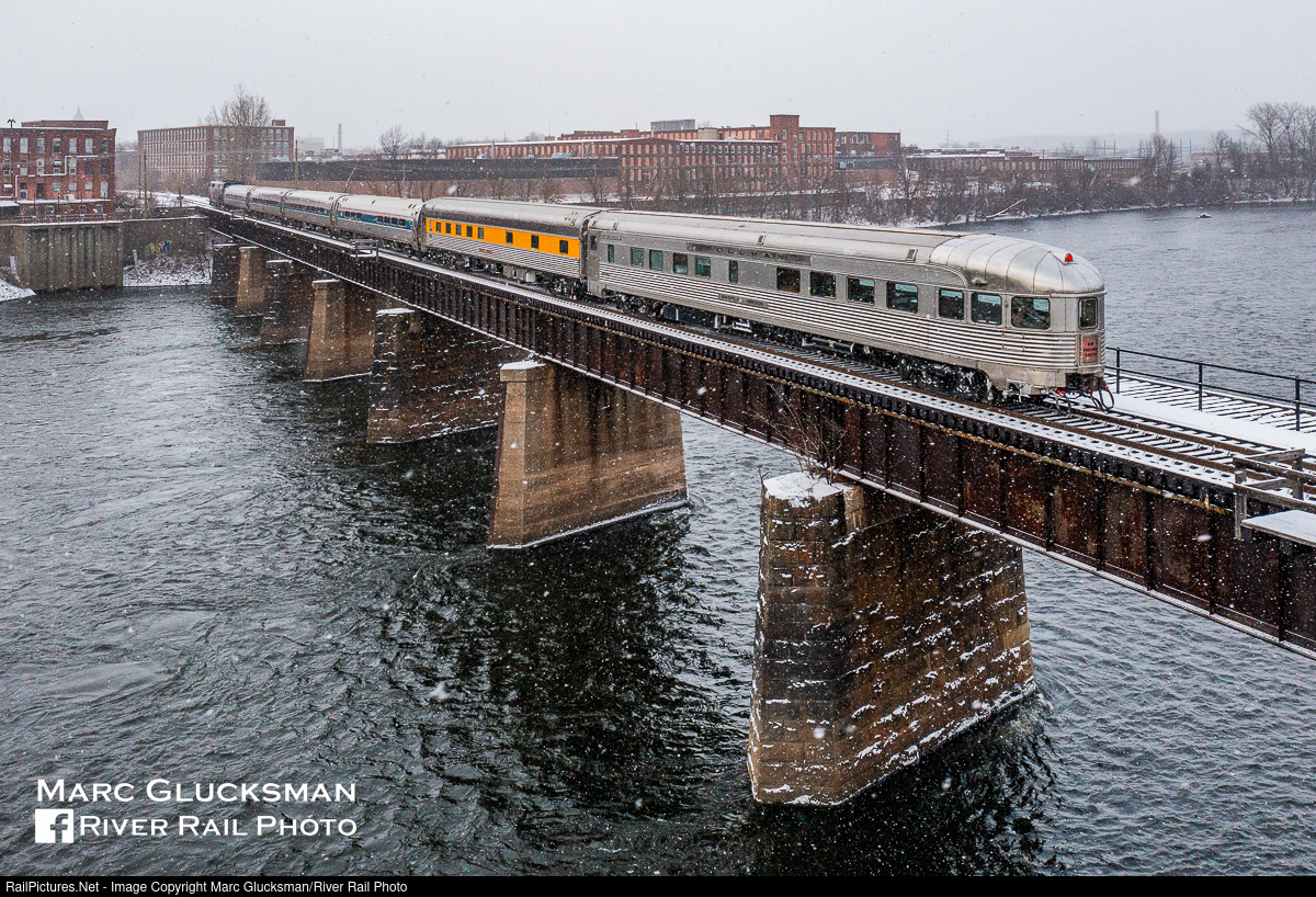 Vermonter In Massachusetts. On Saturday, February 25, 2023, when Webb Rail's former Union Pacific Railroad Budd built Pullman 10-6 slpr "Pacific Union" (WEBX 800640) and former New York Central Railroad Budd built Pullman obs/diner/slpr "Babbling Brook" (WEBX 800007) were holding the markers on Amtrak Train 54 (Vermonter) as it passed over the Connecticut River towards Holyoke, Massachusetts. The cars would spend the night in St. Albans, Vermont before returning the next day.