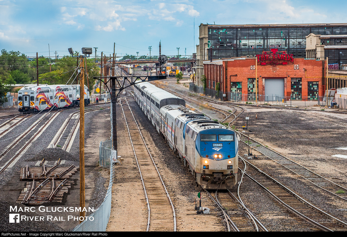 Santa Fe All The Way. On August 5, 2016, Amtrak Train 4 (Southwest Chief) was approaching the station in Albuquerque, New Mexico with AMTK 144 (P42DC, GE) leading when it passed under the former Atchison, Topeka and Santa Fe Railway cantilever signal in front of the former AT&SF shops with its signature "Circle and Cross" logos. Notably, they was an age of transition as the train has both a heritage (AMTK 1241, née-ATSF 3500, Budd, 1953) and a Viewliner II (AMTK 61065) baggage car. Once the biggest employer in Albuquerque, during the 1940s over 1,500 people worked here, one of four large shops on the railroad. As facilities were closed while the company transitioned from steam to diesel, this shop started to lose its significance and instead AT&SF modernized the Cleburne, Texas, and San Bernardino, California locations. By the 1980s it was scaled down to a maintenance of way base, and was closed and eventually purchased by the City of Albuquerque in 2007 for $8.5 million. Various redevelopment overall efforts have stalled, but the Blacksmith Shop building has hosted the Rail Yards Market ABQ for almost a decade. In the background on the opposite side of the tracks, a New Mexico Rail Runner Express train heads into its yard.