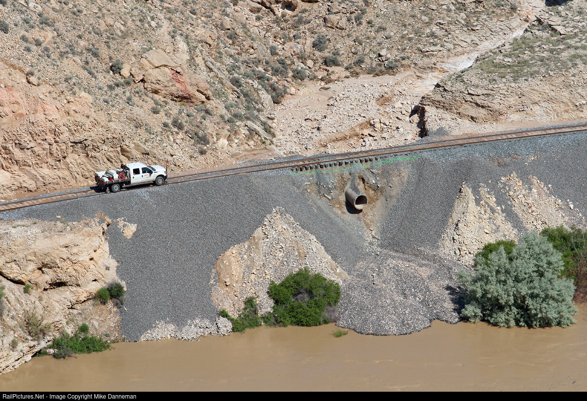 Right after the passage of BNSF’s Cowley turn in Himes Canyon, maintenance-of-way got track and time in the block so they could continue working on a washout that occurred in the middle of the canyon along the Big Horn River. The area marked in green will need more riprap and ballast to fully finish this job.