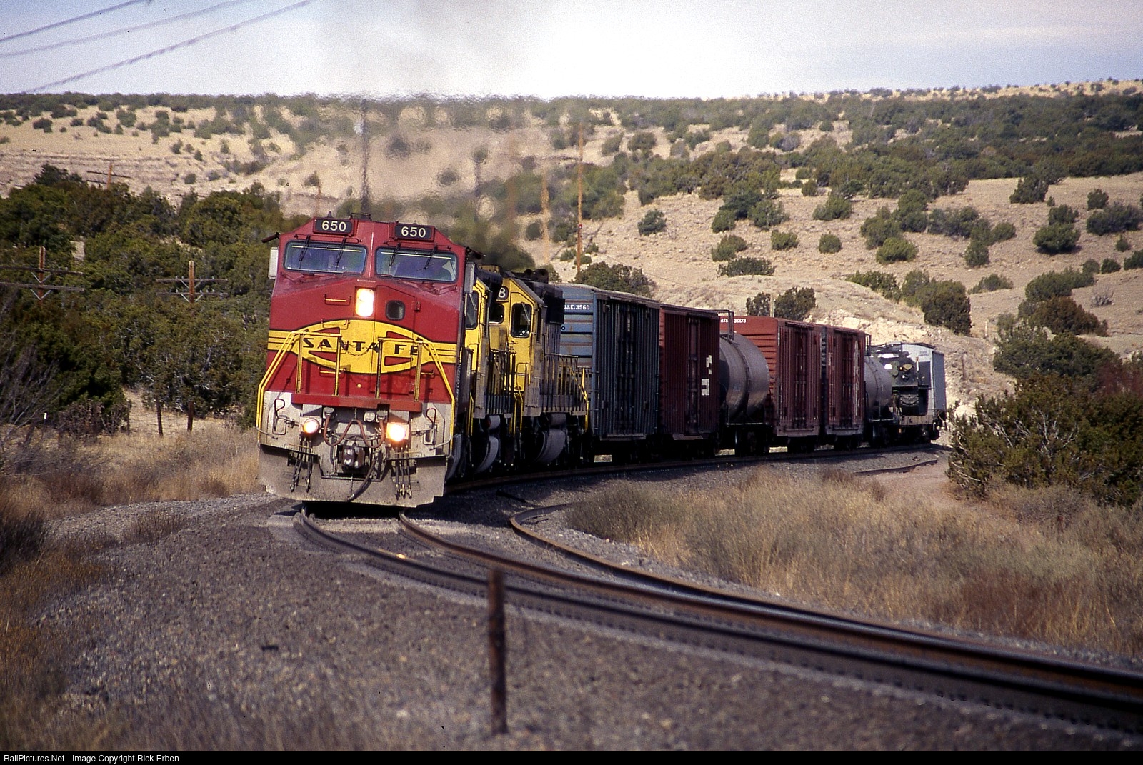 Santa Fe 650 leads an eastbound manifest out of Abo Canyon on the long grade to Mountainair. A second main track was added to this busy route a few years later but at this time the railroad was pushing some 70 or more daily trains through a long single track section that began just in advance of the 650 at Scholle. Most likely there were one or more westbounds waiting their turn through the canyon.