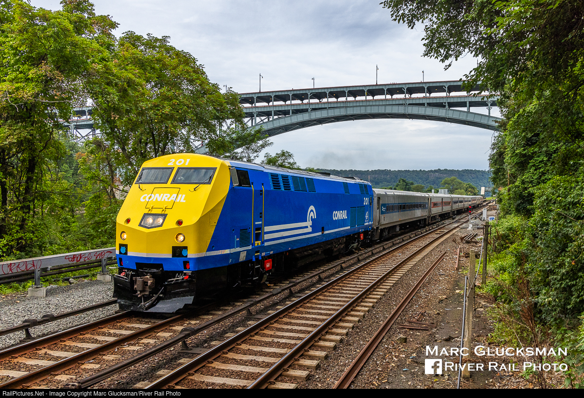 The Newest Heritage Unit! MTA Metro-North Railroad Train 728 featured the south/east facing with MNCW 201 (Conrail/MTA, 40th Anniversary) leading through Spuyten Duyvil, Bronx, New York and under the Henry Hudson Bridge on Monday, August 14, 2023. This unit is one of several selected for a "wrap" to celebrate a predecessor railroad, so far the second released in a series. Normally the locomotive would be on the opposite end of the train, but was turned for this special occasion. The Consolidated RAIL Corporation (Conrail) took over from Penn Central and Erie Lackawanna in 1976 and operated the Hudson, Harlem, New Haven, Port Jervis, and Pascack Valley Lines until Metro-North assumed control of these lines (New York portions of the West-of-Hudson Lines) in 1983.