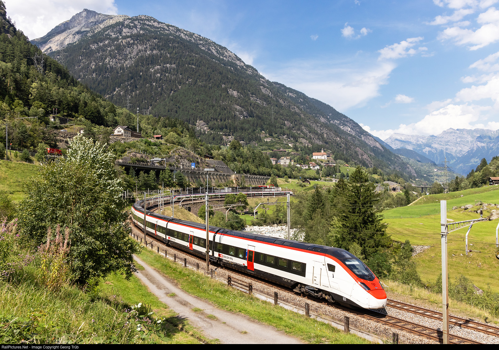 On August 10, a northbound freight train derailed in the 57-kilometer-long Gotthard Base Tunnel, and since then both tubes have been closed. All passenger traffic, as well as freight traffic that can pass through the smaller profile, travels via the Gotthard mountain route, today also called the panorama route. "Giruno" highspeed trains RABe 501 # 026 "Basel-Stadt" and # 017 "Fribourg" of the SBB in multiple control are rounding the Wattinger curve between Gurtnellen and Wassen with train 10873 from Zürich to Lugano. The velocity for this passenger trains is 80 km/h here.