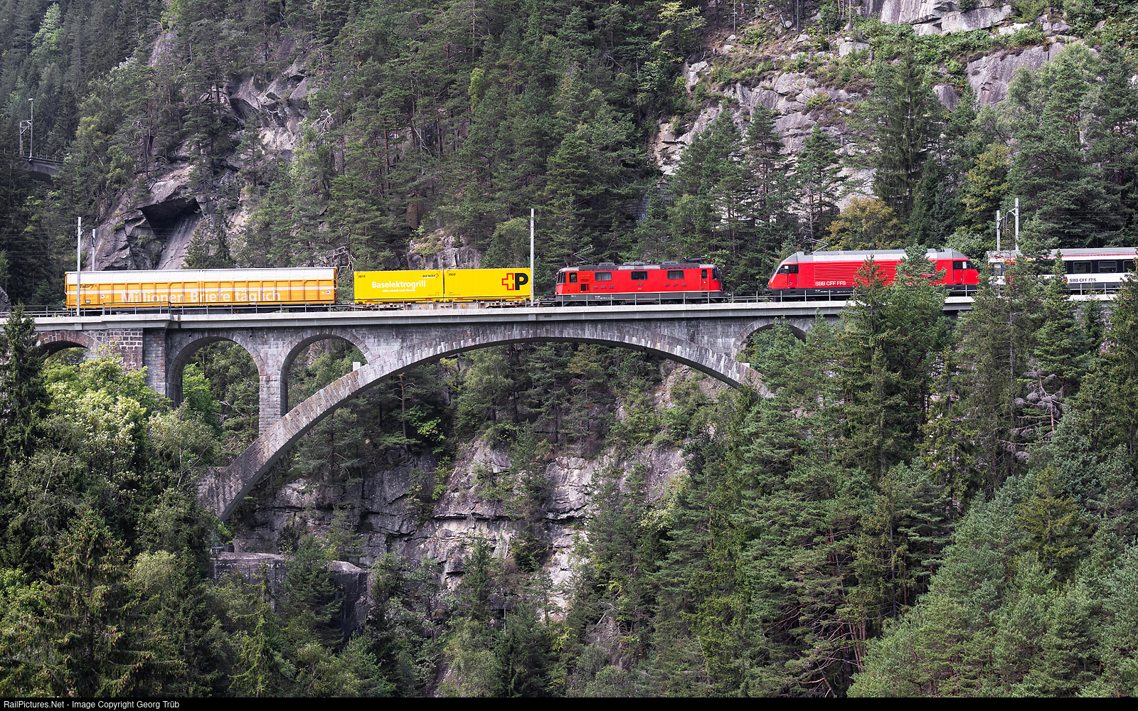 On August 10, a northbound freight train derailed in the 57-kilometer-long Gotthard Base Tunnel, and since then both tubes have been closed. All passenger traffic, as well as freight traffic that can pass through the smaller profile, travels via the Gotthard mountain route, today also called the panorama route. A very rare coincidence when two trains meet on the 122 meter long and 70 meter high Mittlere Meienreussbrücke in Wassen. Southbound from the left is Re 420 # 339 (Re 4/4 II # 11339) with mail train 50021 from Härkingen to Cadenazzo, which on this day consisted of only two cars. From the right and heading north is IC 10316 from Chiasso to Zurich, a push-pull train with loco Re 460 # 026. The viaduct, former a truss bridge, was new built in concrete with stone cladding in 1961/1962 and has a main span of 63 meter.