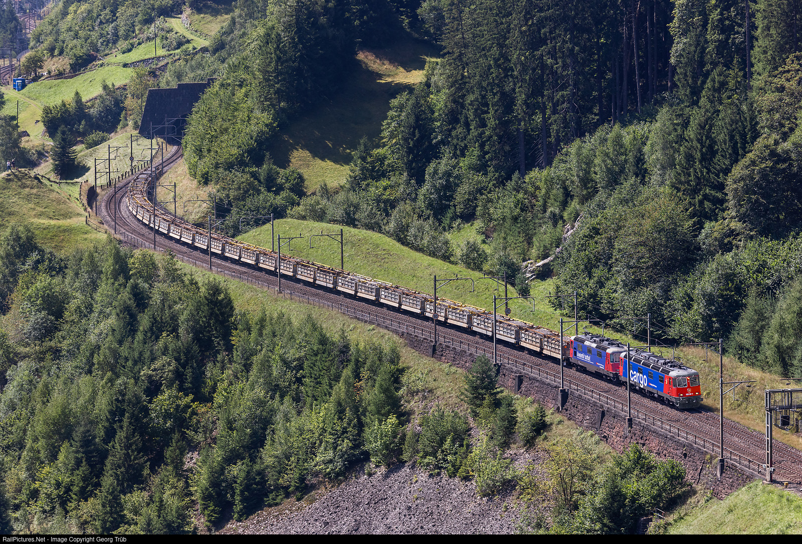 Since the derailment of a northbound freight train in the Gotthard Base Tunnel on august 10, both bores of the base tunnel are closed for several days. All passenger trains and some freight trains goes over the Gotthard mountain line, now called panorama line. Re 620 # 067 and Re 420 # 288 (Re 6/6 # 11667 and Re 4/4 II # 11288) in multiple control, called a "Re 10/10", pull the northbound freight train 69726 from Chiasso freight yard to Biel Produktionsanlage Ost (former called shunting yard) on the uppermost level of the loops between Göschenen and Wassen. The load are cars of the infrastructure loaded with used ballast, about 1400 gross tons.