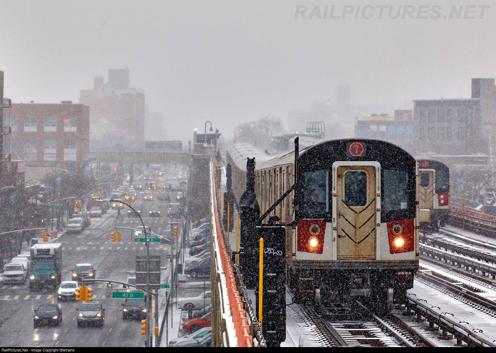 New York City Transit Authority (NYCTA) R188 no. 7455 (Kawasaki, 2010-2016) is the lead motor on a Manhattan-bound 7 train on the IRT Flushing Line. This day was one of those wintery days in the city with continuous snowfall during the day with both Rail and Road traffic unaffected