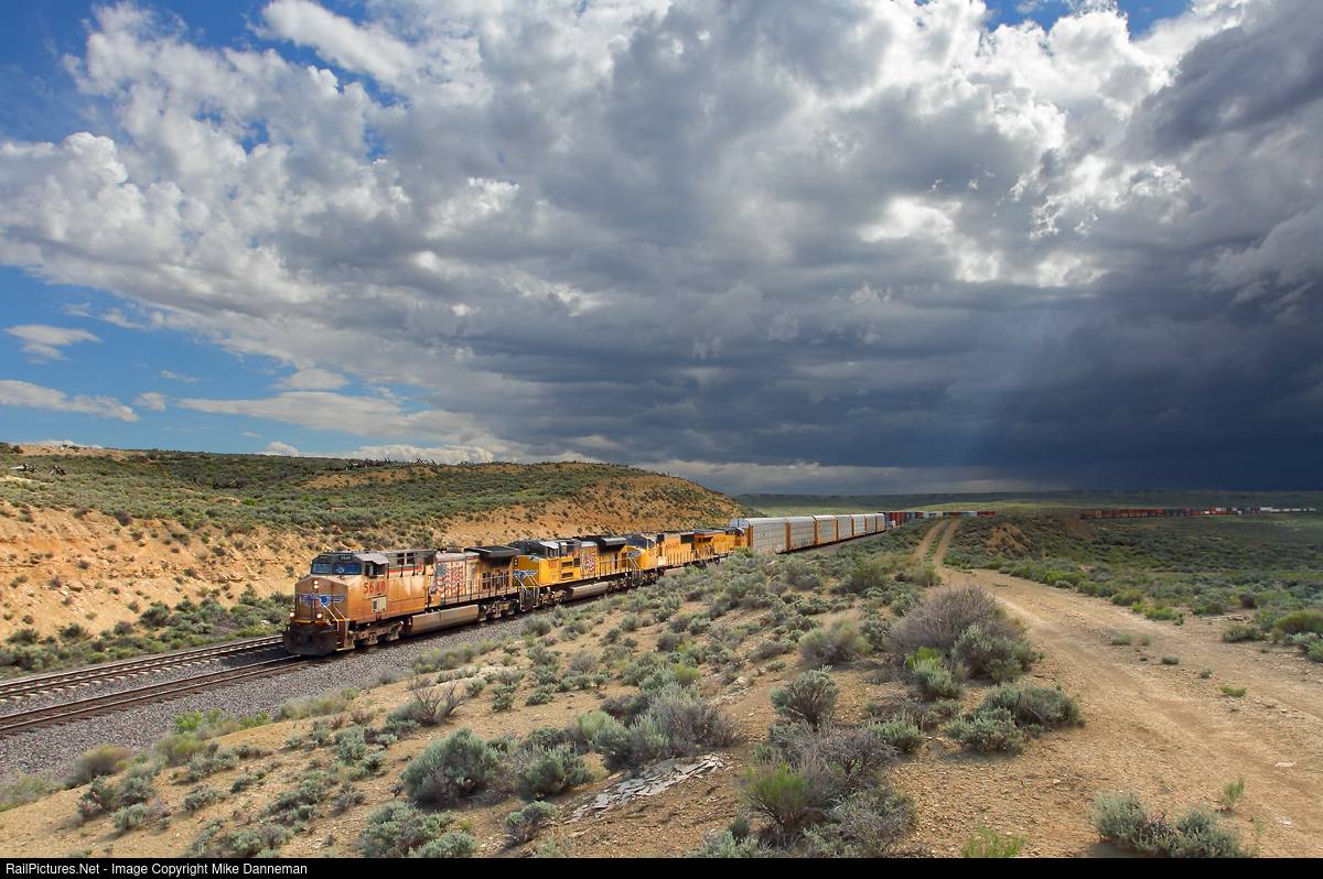 Staying ahead of the storm An eastbound Union Pacific manifest freight train drops downgrade at milepost 823 on Peru Hill, Wyoming, momentarily staying ahead of a storm approaching from the west on the afternoon of June 22, 2023.