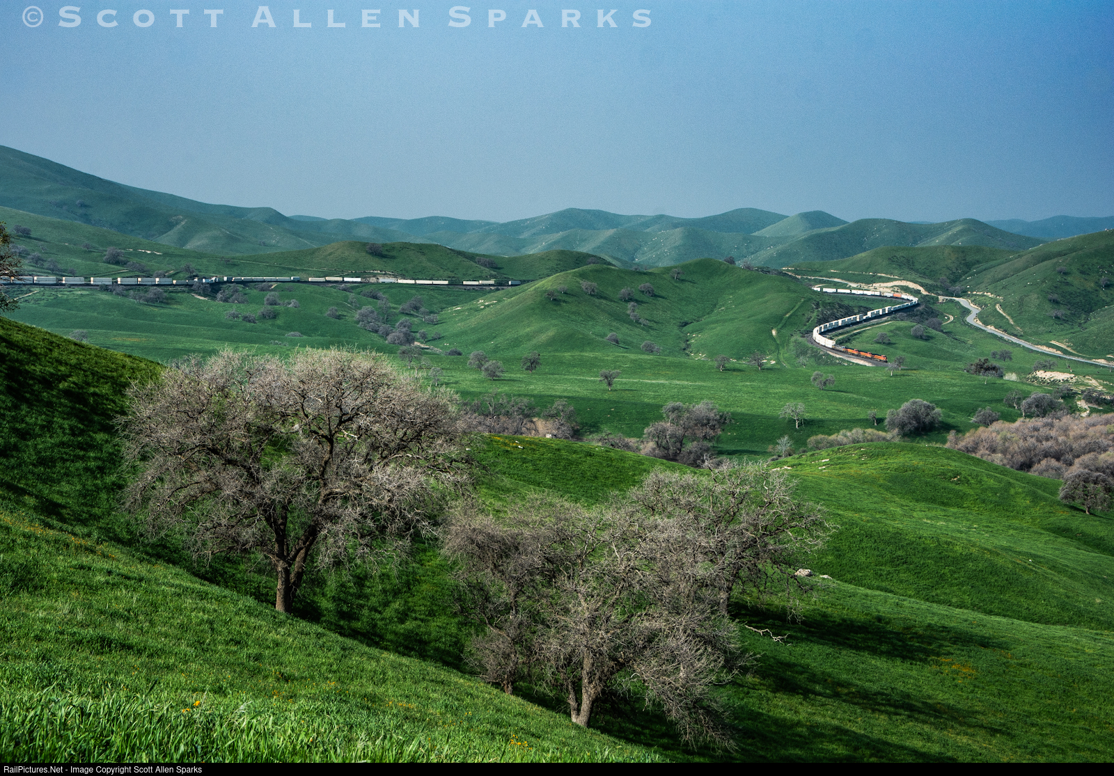 On a wet, misty winter morning, in the highly saturated lower Tehachapi foothills, a north bound BNSF intermodal drifts down the steep grade between tunnels 1 and 2, as the rear portion of the train navigates the curves at the western switch of Bealville siding.