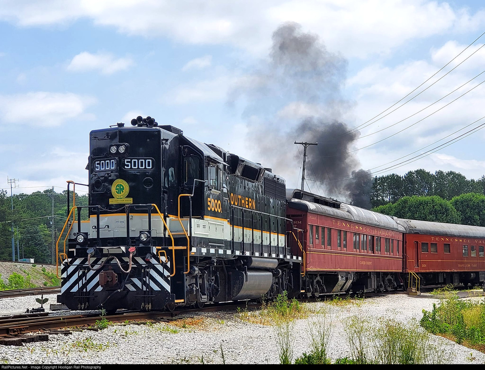 After finishing out its assignment on TVRM's Dinner Train the night before, Southern Railway 5000, the first GP38 purchased by the Southern rests on one of the exhibit tracks at Grand Junction In Chattanooga, Tennessee as the smoke from Southern Railway 4501, also the first Ms class Mikado purchased from Southern departs on the Missionary Ridge Local. Photo by Elliott Hool.