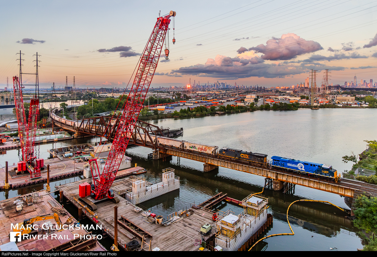 A Picture Of Today's Conrail. CSX Train M421-26 was the right train at the right time crossing Conrail Shared Assets on Sunday, August 27, 2023 with CSXT 1976 (Conrail Heritage, ES44AC, GE) leading over the modern day version of the former "big railroad". At sunset, it is seen crossing the Point-No-Point camelback through truss bridge over the Passaic River from Kearny to Newark, New Jersey with the New York City skyline in the background. This bridge was opened in 1901 by the Pennsylvania Railroad as a freight bypass of its mainline and today serves Conrail Shared Assets trains. Projected to be competed in 2025, at a cost an estimated by Conrail officials as $212 million, it will not only provide a modern structure but also reduce the time for opening the bridge for marine traffic from over 5 hours to about 5 minutes. The Consolidated Rail Corporation was created on April 1, 1976 to bring together the passenger and freight service of 7 large railroad companies and their subsidiary corporations, and was ultimately privatized and purchased by CSX and Norfolk Southern in 1999, leaving the dual controlled Conrail Shared Assets to manage the sections kept separate to avoid giving one railroad an advantage in those areas. This locomotive is one of a series that CSX has started to release with a modern CSX painted cab and a "heritage" body, with the scheme of a predecessor railroad and numbered for the year that company began operating.
