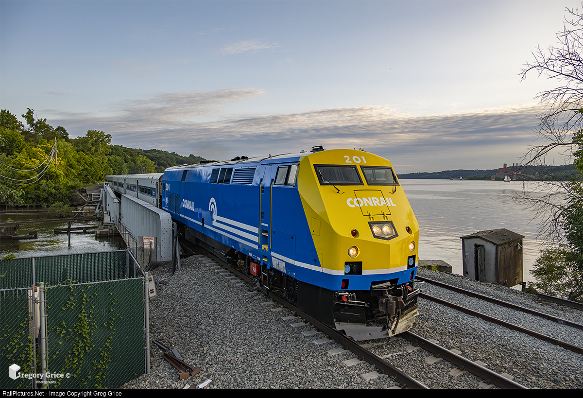 Metro-North's 40th Anniversary "Conrail" heritage-wrapped P32AC-DM, MNCW 201, leads train 855 over the Wappinger Creek Railroad Bridge as the sun sets at New Hamburg, New York on August 23rd, 2023.