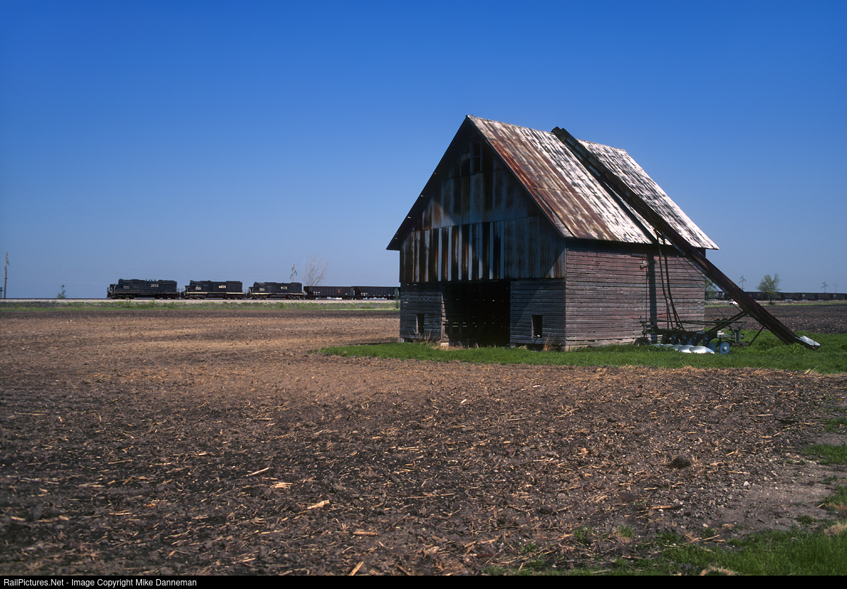 A southbound Illinois Central freight train, with coal hoppers behind the locomotives, passes a picturesque barn between Ashkum and Danforth, Illinois, on May 6, 1990. The modern day IC locomotive roster was all-EMD; pulling this train is SD20 No. 2035—a rebuilt SD24, SD40X No. 6071 and GP38-2 No. 9571, The middle unit, No. 6071, is a rare EMD SD40X built in 1964 and ended up being the first demonstrator of the popular EMD SD40 series.