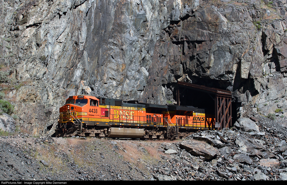 BNSF GE C44-9W No. 4438 leads the railroad’s Laurel to Denver priority freight (HLAUDEN) out of 177-foot Tunnel 4 between the sidings of Dornick and Piper while passing through Wyoming’s scenic Wind River Canyon on June 25, 2023.