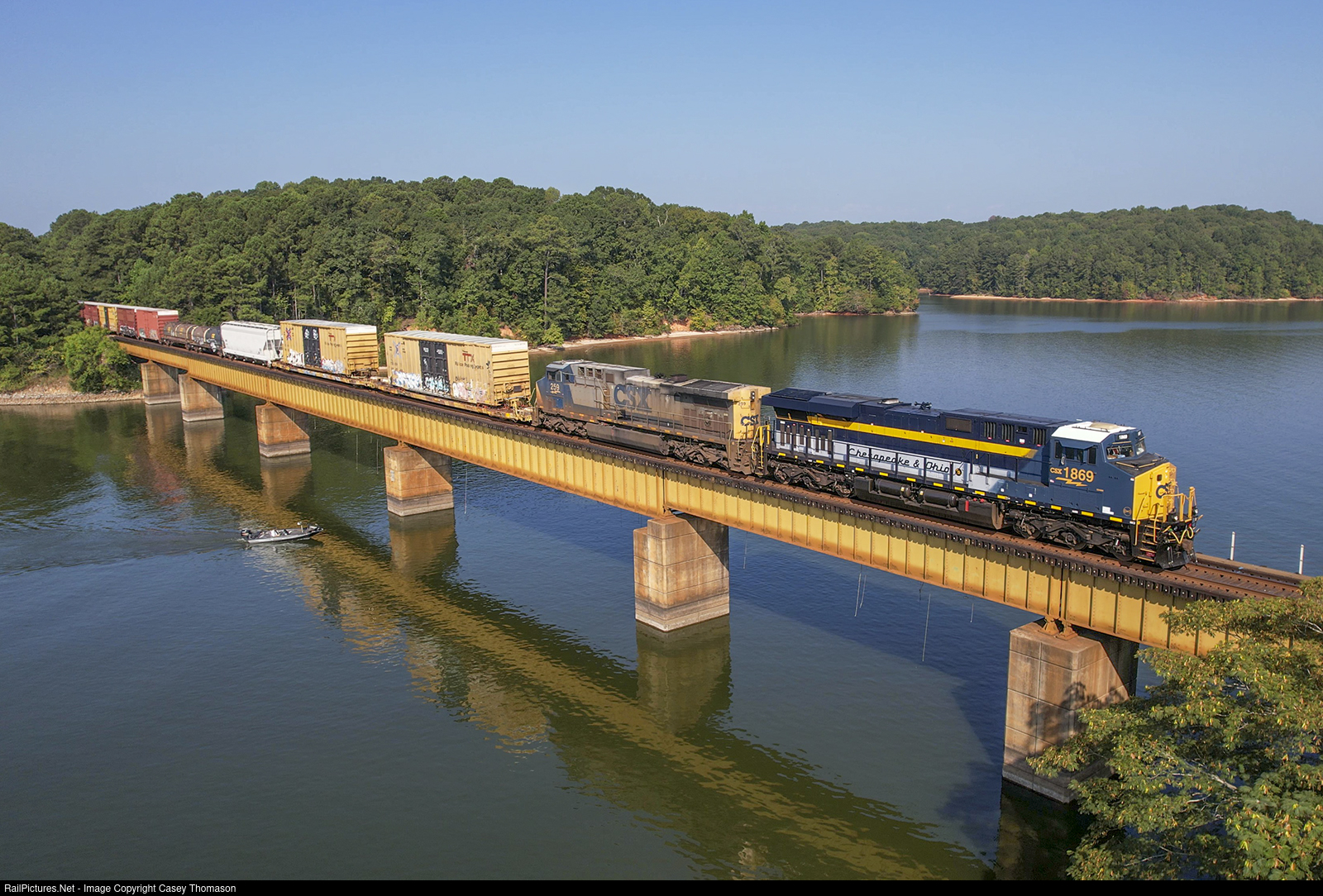 | CSX's C&O heritage unit crosses West Point Lake near LaGrange, GA, with train M22109. |