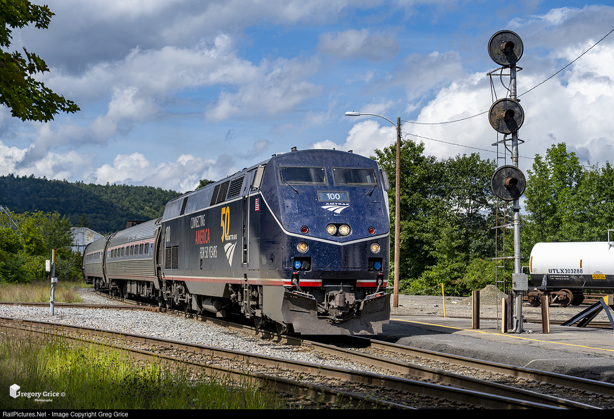 On a September 12th, 2023, Amtrak P42DC #100, painted in "Midnight Blue", leads Vermonter train 55 past the original Boston & Maine signal at Bellows Falls, Vermont on the NECR Palmer Subdivision. These signals are operating on borrowed time as Genesee & Wyoming continues to make upgrades along the line.