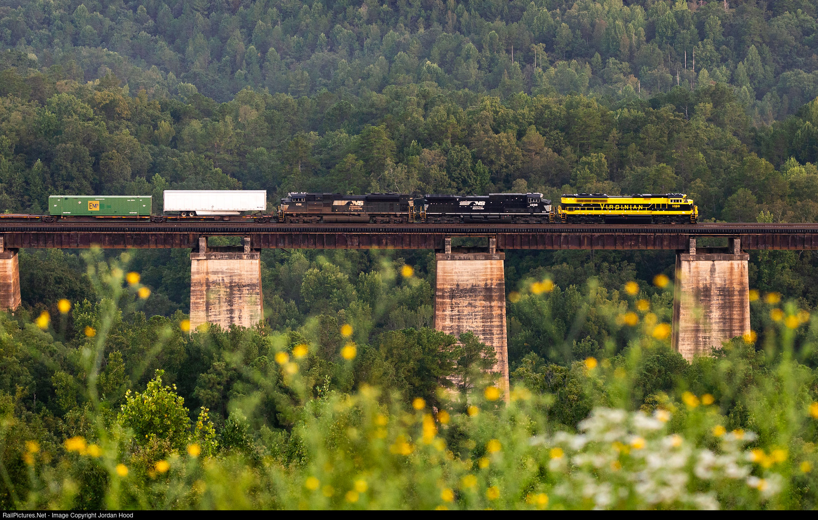 The recently repainted Virginian heritage unit races across Wells Viaduct with premium intermodal 24X in tow.