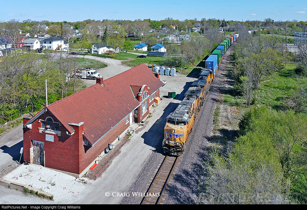| This old ex-Rock Island depot along the UP Trenton Sub in Chariton is still used by the UP. It is hard to believe that this old gem has stood the test of time. The UP Trenton Sub is the south end of the old Rock Island Spineline that once ran from St. Paul to KC. Here we have a Global 1 to LA stacker working past the depot barking up the .80% grade out of the Little White Breast Creek Valley. |