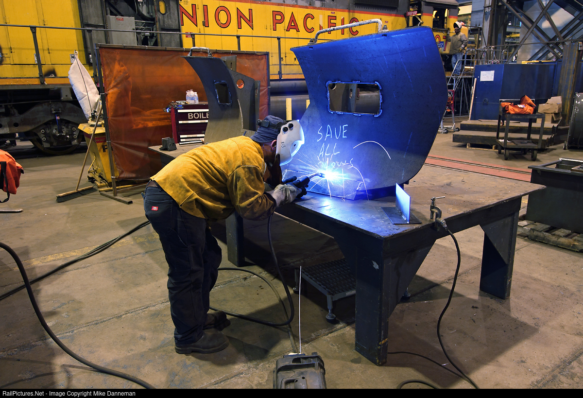 At Union Pacific’s Downing B. Jenks Shop at North Little Rock, Arkansas, A welder from the boiler shop (boilermaker by trade) carefully repairs a locomotive snow plow on May 19, 2015. In the background UP EMD SD40-2 No. 3071 is in the middle of a transformation into a rebuilt SD40N.