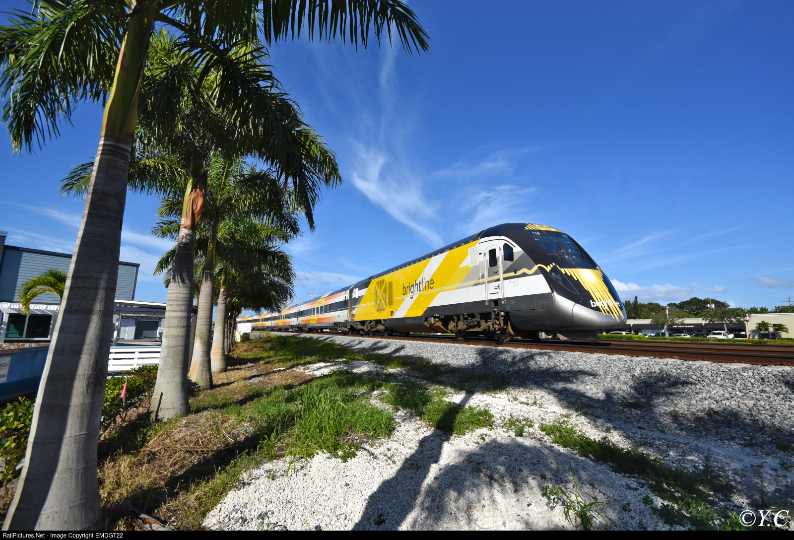 | Brightline's BrightOrange trainset rounds the curve as it approaches the Jupiter drawbridge on its way to West Palm Beach. This was the railroad's first day of revenue service on its Orlando-WPB line, connecting the two cities in just over two hours. Trains must slow down here to cross the Loxahatchee River, but reach a top speed of 125 miles per hour on the northern portion from Cocoa to Orlando. |