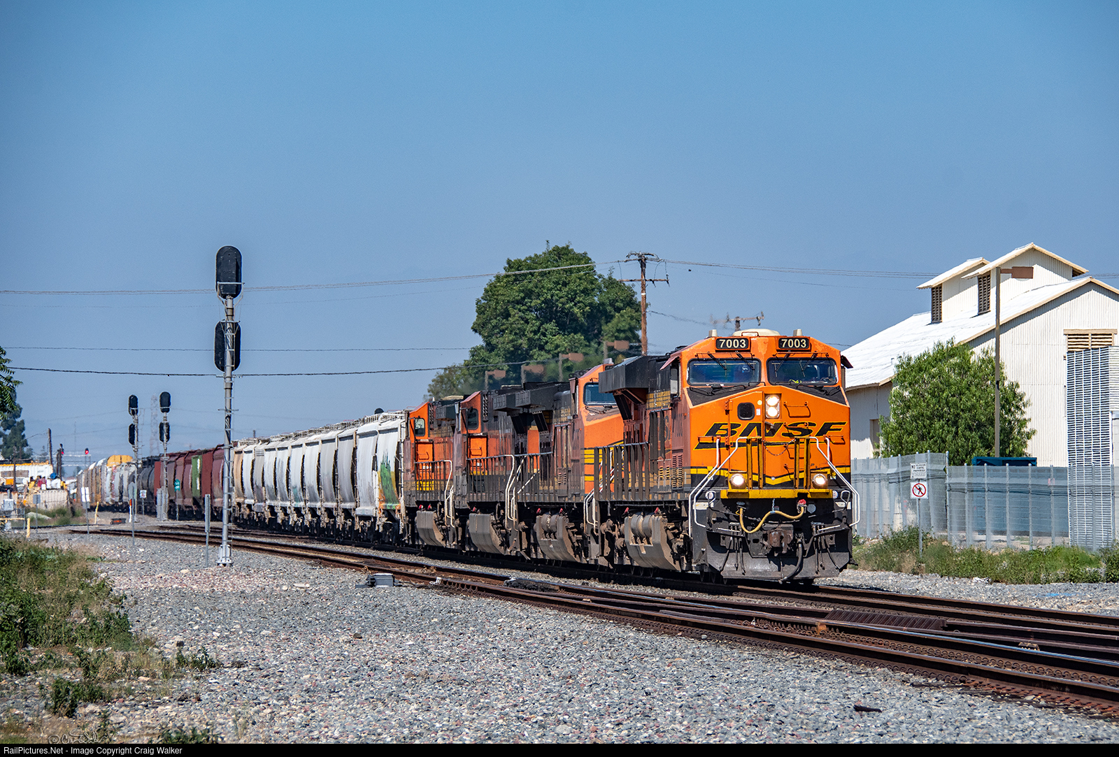 Rolling off Metrolink's 5½-mile-long Olive Sub and onto Metrolink's Orange Sub is BNSF Railway train H-BARSDG, a (supposedly) High Priority freight heading from Barstow to San Diego. At this point, the head-end power is now on the Orange Sub while the rest of the train is on the Olive Sub. Providing the muscle up front are BNSF ES44C4 7003 and three Dash 9-44CWs: 5275, 1052 and 4436, with two more Dash 9-44CWs (4602 and 4326) for the rear Distributed Power Units (DPU). (Orange, California – September 24, 2023)