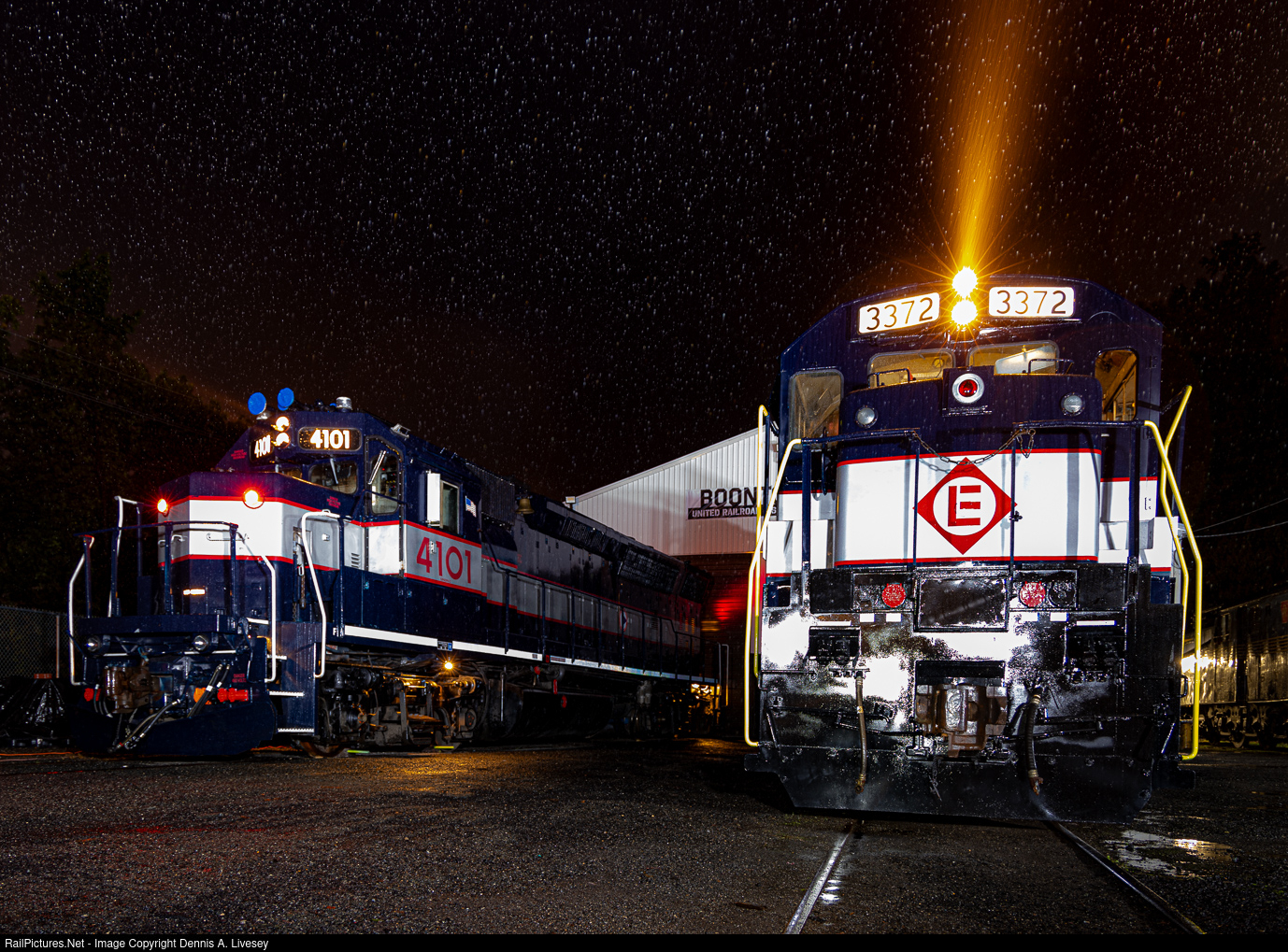 | Erie-Lackawanna U34CH No. 3272, recently repainted, shares space with NJ Transit's GP40PH-2 No. 4101 in the United Railroad Historical Society's Boonton Yard during a surprise night shoot with lighting provided by Michael Burkhart. Being on the edge of a hurricane kept the entire weekend very wet. As can be seen, it was a challenge to work in but we all got images to remember. Steinheimer would approve. |