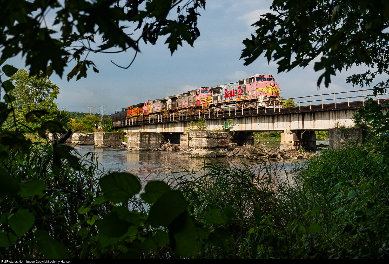 Santa Fe All The Way! Following some afternoon rain showers, the sun made an appearance just in time for train L-CHI105 with a trio of antique Santa Fe warbonnets at the helm. B40-8W #552 leading C44-9W #’s 673 and 674, followed by a regular BNSF GEVO. They are seen here crossing the Des Planes River bridge in Lemont, where the Santa Fe used to run everyday before the BNSF merger In 1995. 27 years after the railroad merger, these three locomotives still wear their veteran Santa Fe warbonnet paint. Seeing one at the point of a train In 2023 is pretty rare. But three on one train, and on former Santa Fe trackage is the icing on the cake!