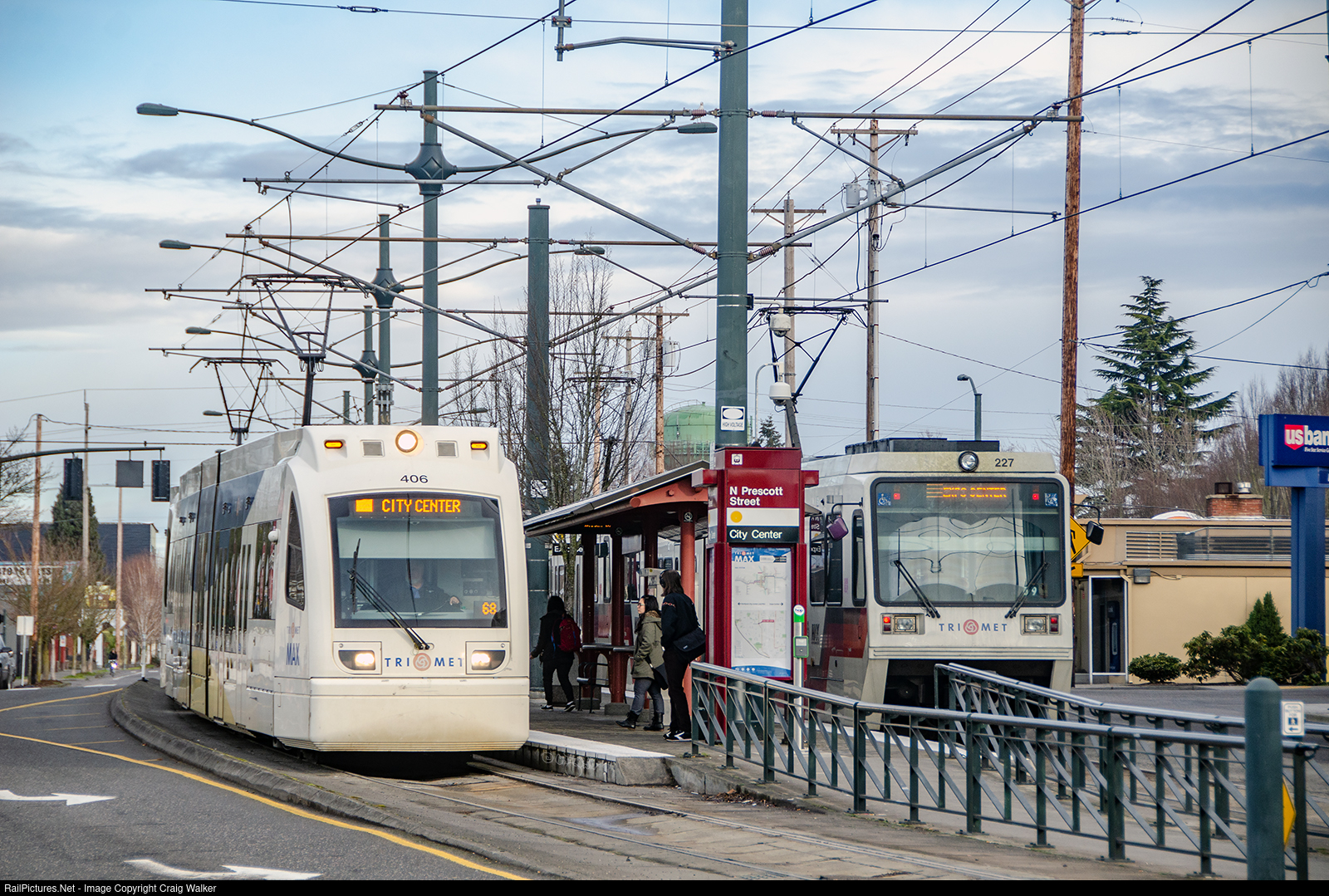 A southbound Tri-County Metropolitan Transportation District of Oregon (MAX) light rail vehicle (a streetcar back in the day) makes its stop at the North Prescott Street Station as it heads from North Portland through City Center to Milwaukie. This train is comprised of Siemens AG S70 LRVs 406 and 536. Across the platform, a northbound Yellow Line train, with MAX Siemens AG SD600 227 trailing, also makes a stop. (Portland, Oregon – January 23, 2017)
