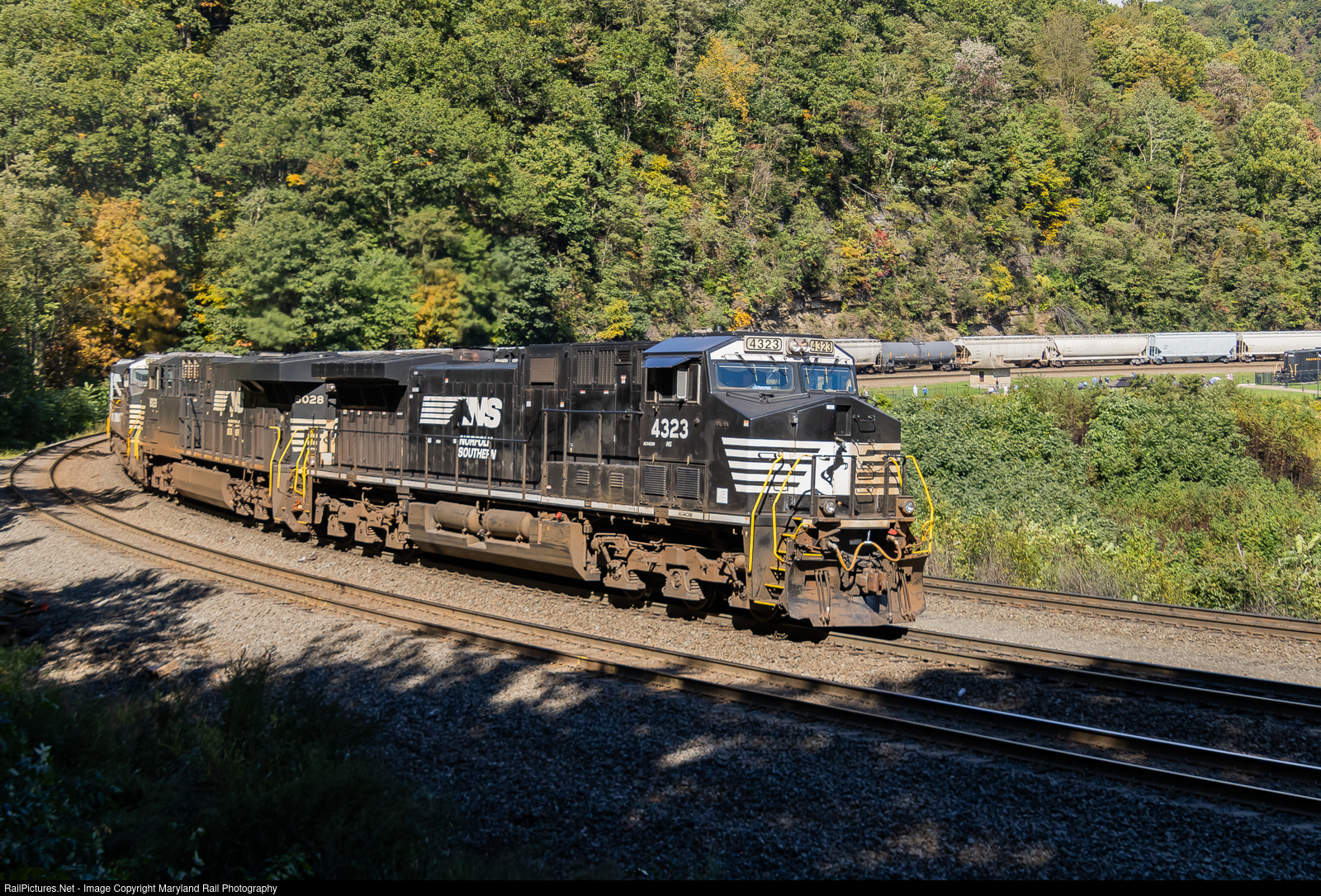 | Norfolk Southern W/B Manifest Train 11V is rounding the World's Famous Horseshoe Curve in Altoona, PA with some fall colors in the Allegheny Mountains |