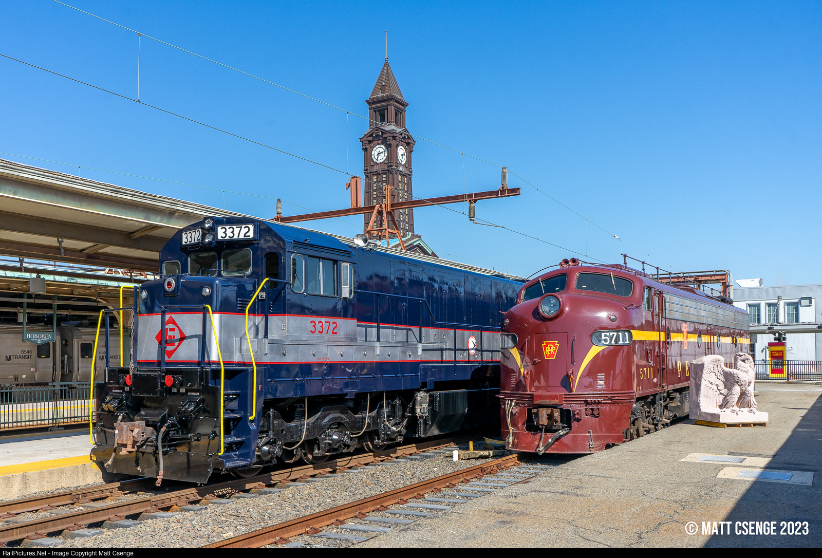 Erie Lackawanna Railway (EL) U34CH no. 3372 (GE, 1970-1973) and Pennsylvania Railroad (PRR) E8 no. 5711 (EMD, 1949-1954) are seen side by side during NJ Transit's 40th Anniversary event at Hoboken Terminal. The locomotives were on loan for the event from their respective owners, the United Railroad Heritage Society of New Jersey (URHS) and the Juniata Terminal Company. On the platform next to the E8 is one of the stone eagles from the original Pennsylvania Station in New York, which was rescued when the palatial station was demolished.