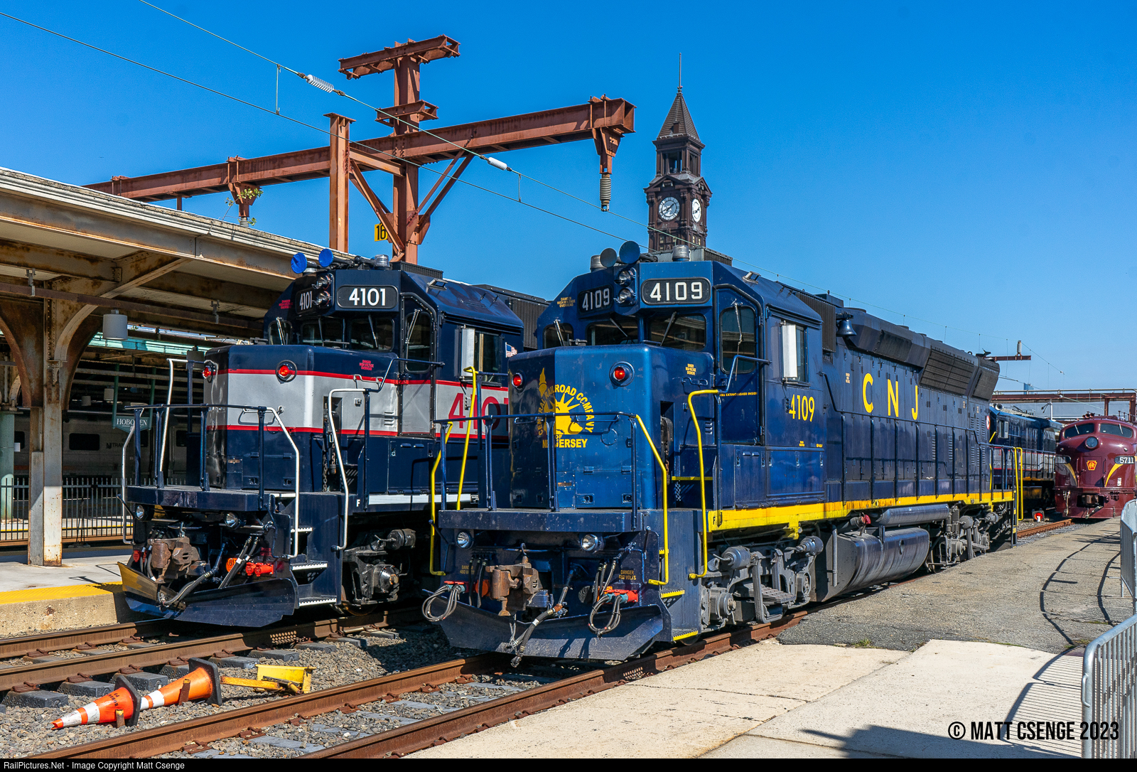 NJ Transit GP40PH-2 no.s 4101 and 4109 (EMD, 1968) are seen side by side at the railroad's 40th anniversary event at Hoboken Terminal. These locomotives actually predate the railroad, having been built for the Central Railroad of New Jersey prior to NJ Transit Rail Operations taking over operation of the commuter railroads in the State of New Jersey. |