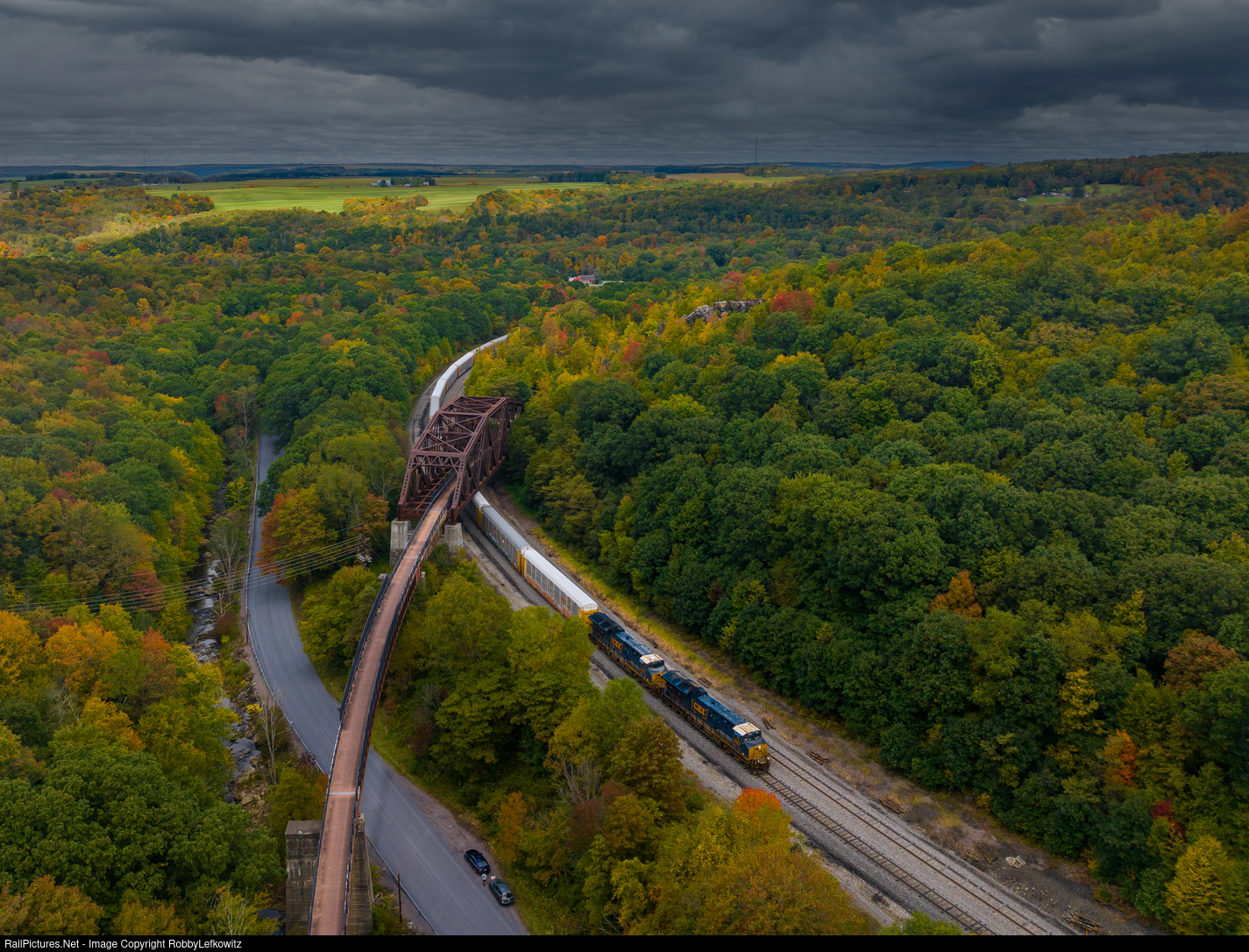 Loaded autorack train CSX M276 wraps around a curve, as it heads under the Keystone Viaduct. This train is trying to keep ahead of the brewing storm line forming in the background. |