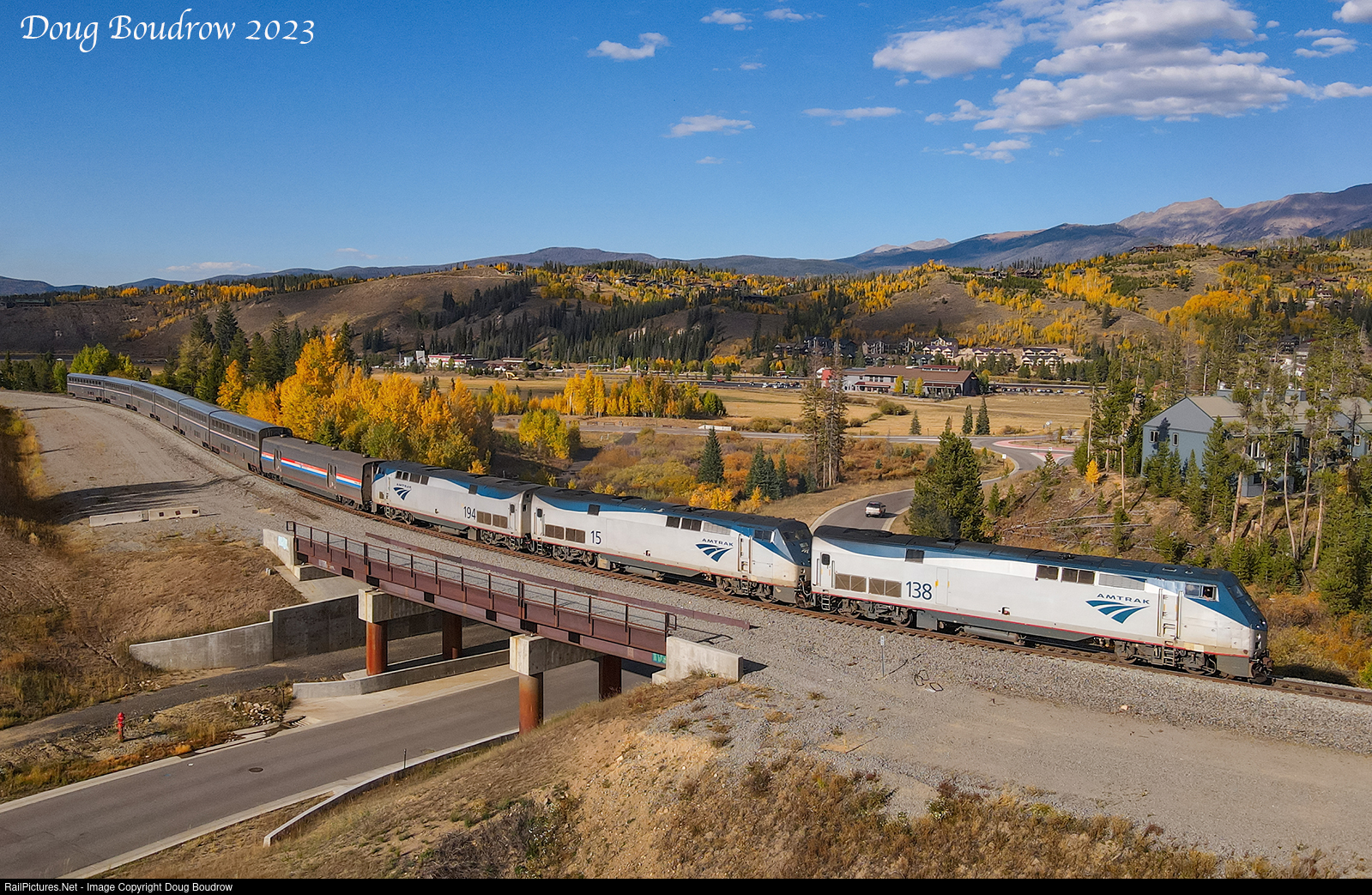 | The Eastbound Amtrak train 6, the California Zephyr is seen passing through Winter Park, traveling to Denver from Glenwood Springs The aspen trees are at peak foliage during what locals call "gold week." |