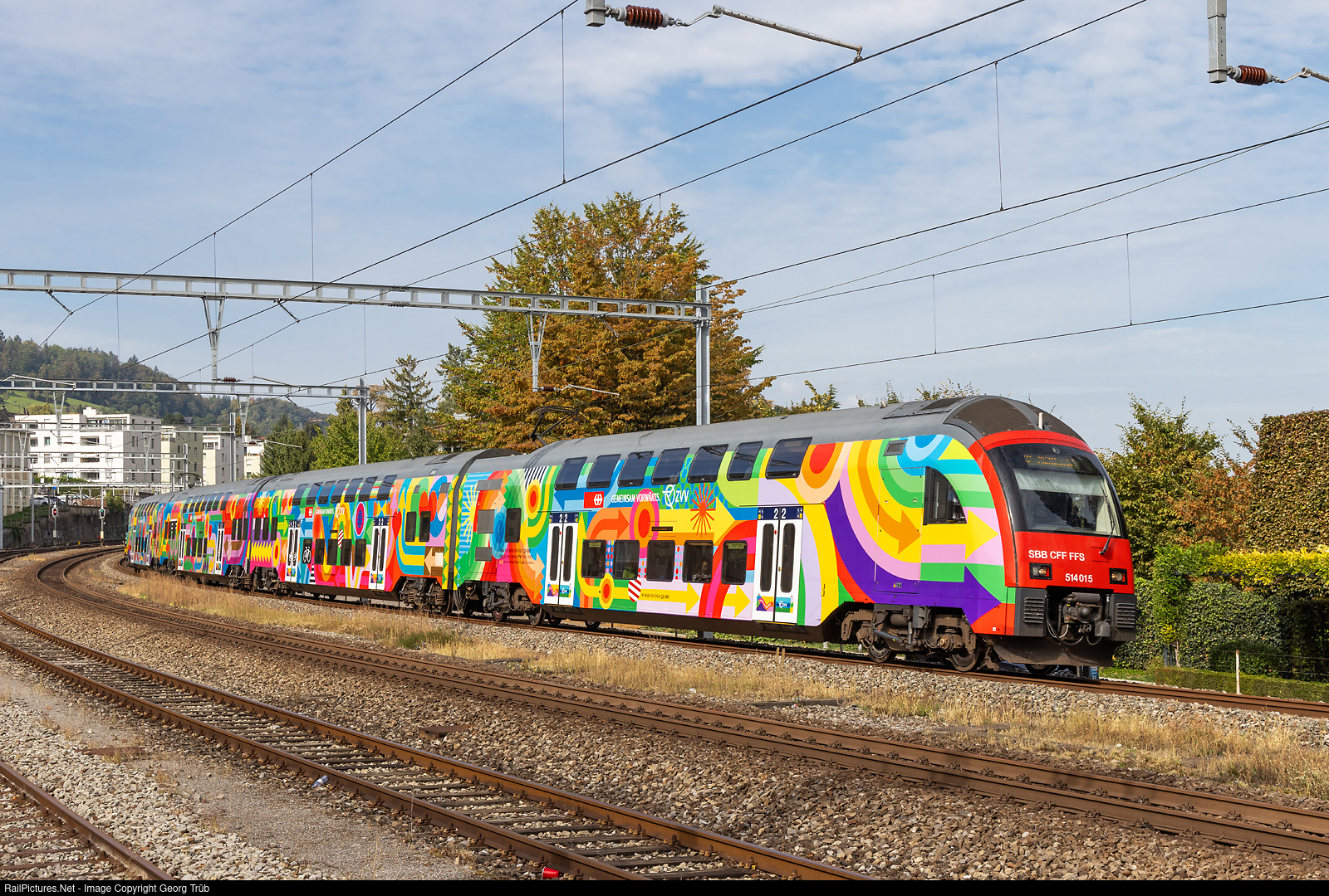 | The Siemens "DTZ" (doubledeck multiple unit) RABe 514 # 015 got an extremely colorful publicity paint scheme for the ZVV (Zürcher Verkehrsverbund/Zurich traffic association) with the new claim "gemeinsam vorwärts" (together ahead). Entering Horgen running as train 18847 of the line S8 from Winterthur via Wallisellen-Zürich mainstation-Zürich Enge-Thalwil-Wädenswil to Pfäffikon SZ. |