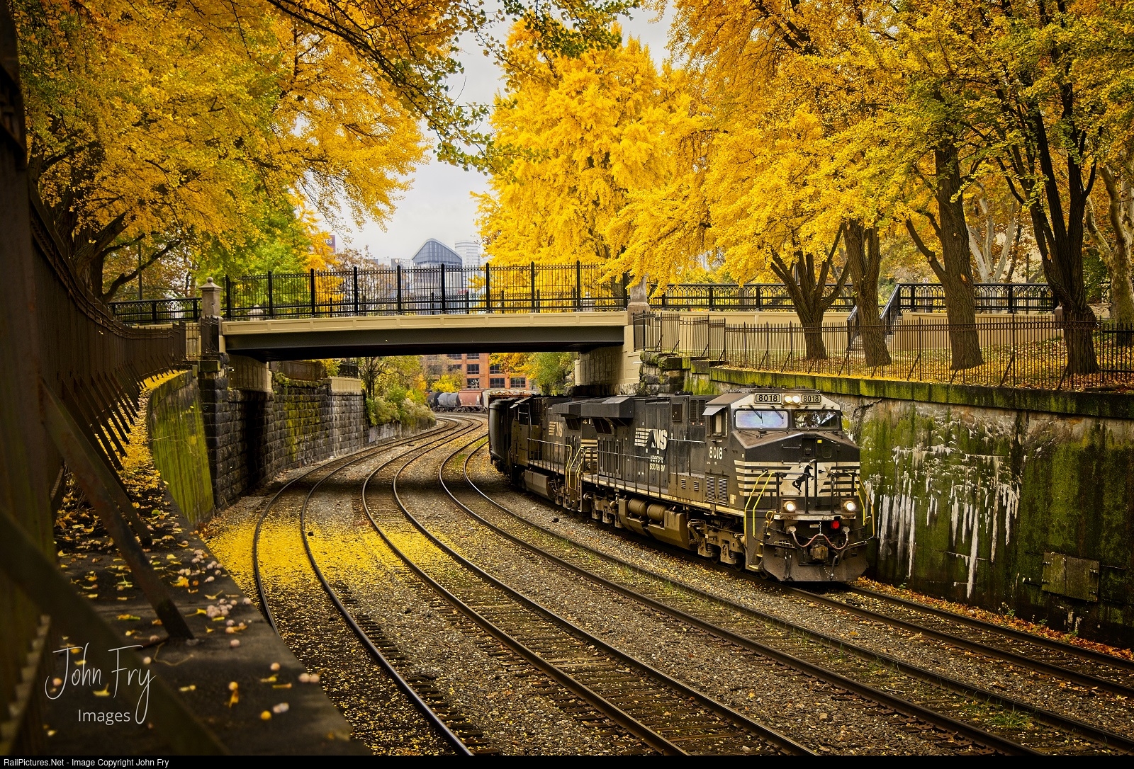 | An NS manifest navigates the trench in fall splendor with some of the downtown Pittsburgh skyline in the background.