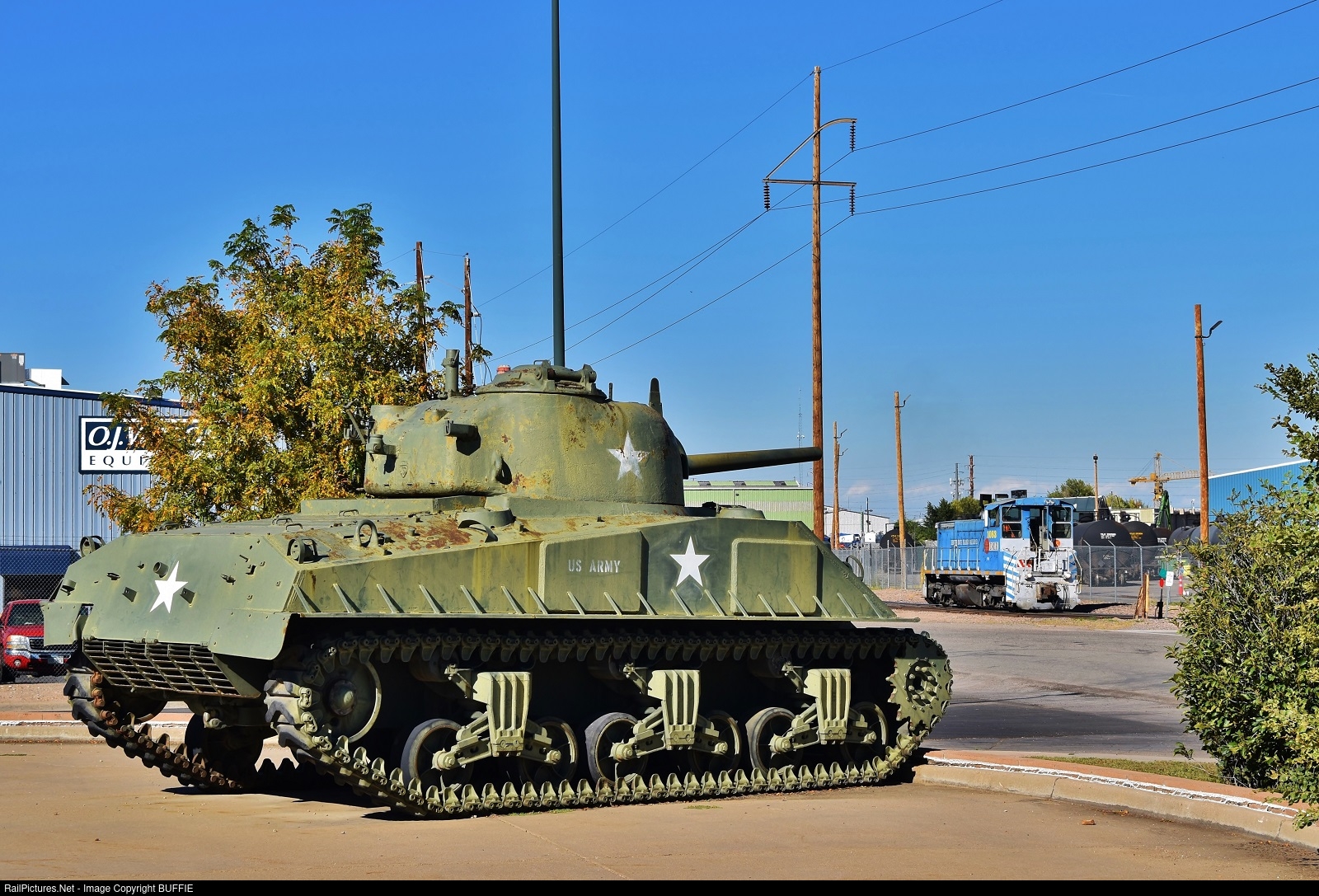 | The operations area of the Denver Rock Island Railroad runs adjacent to the Colorado National Guard base which is located in an industrial area known as The Stockyards. Here we see DRIR 1083 (SW1500) passing an M4 Sherman Tank on display in the parking lot.