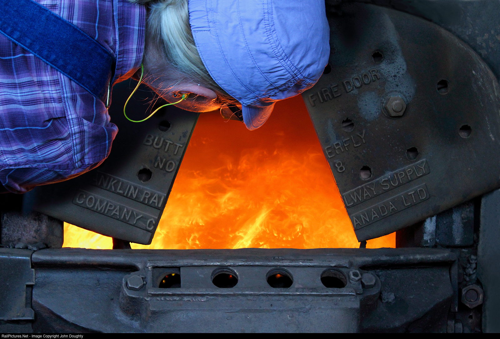 Rikki Durden, who is a qualified Engineer, Fireman, and Conductor on the Tennessee Valley Scenic Railroad in Chattanooga, Tennessee, checks the fire in Southern 4501. She is also a qualified mechanic, very knowledgeable about all things trains, and simply loves being around trains, especially steam locomotives. This was my second time riding in the cab of the Southern 4501, as well as a ride in the cab of Southern 630, and it is well worth the cost. Photo taken with permission from Rikki Durden.