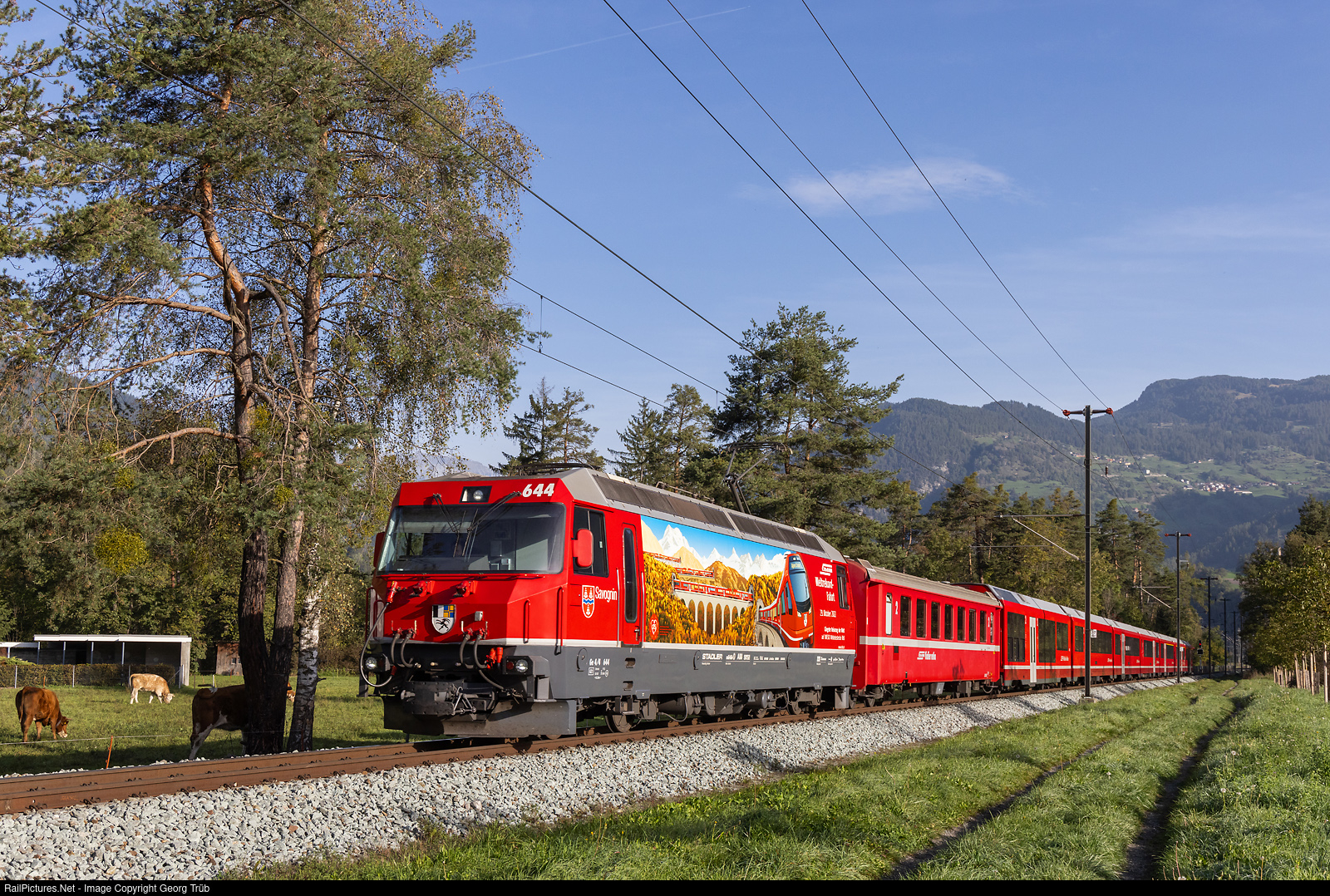 | Ge 4/4 III # 644 of the Rhaetian Railway in the publicity paint scheme for the world's longest passenger train on narrow gauge, pulling the Interregio 1125 from Chur to St.Moritz, between Rodels-Realta and Cazis |