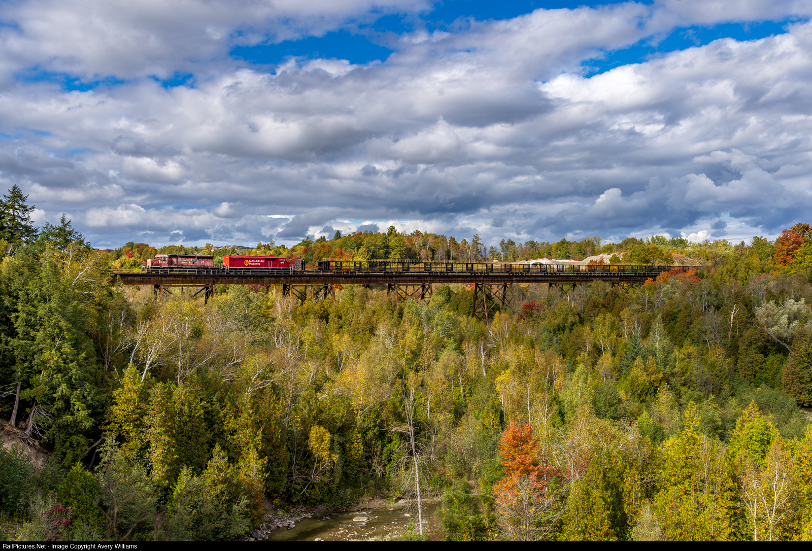 A CP Rail Train, hustles over the Cherrywood trestle with a few ribbons of rail left to be unloaded.