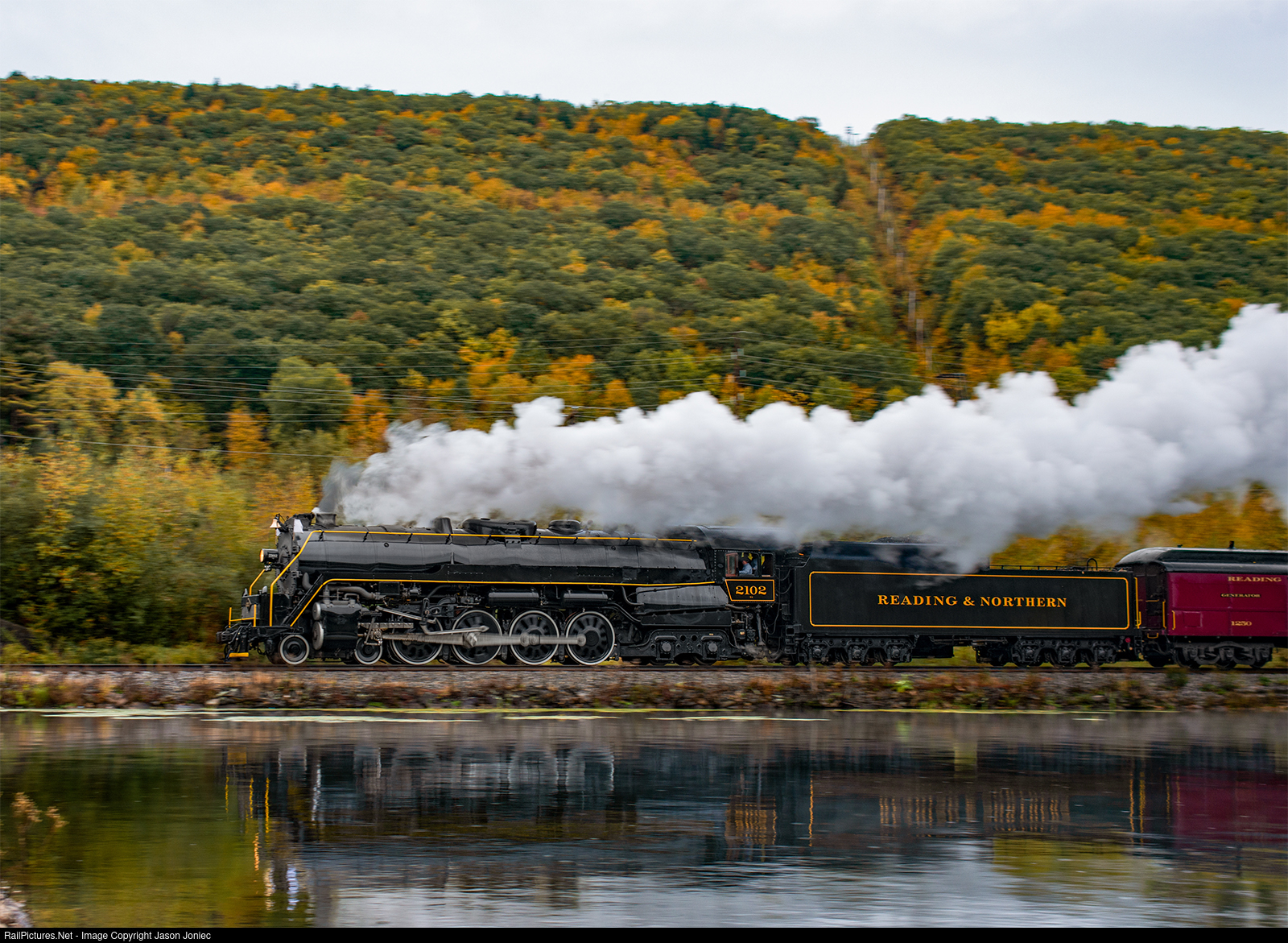 Reading and Northern T-1 2102 streaks along Lake Hauto near Nesquehoning with the October 14th Fall Foliage Special.