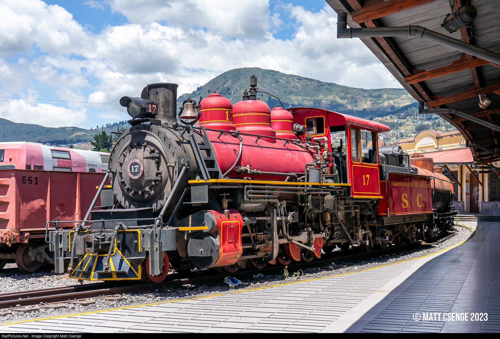 Ferrocarriles del Ecuador locomotive 17 is seen sitting quiet with other Tren Ecuador equipment at Estación Chimbacalle in the Ecuadorian capitol of Quito. The locomotive is a Baldwin 2-8-0 built in 1935 for the narrow gauge Guayaquil & Quito Railway. Currently all railway services in Ecuador are suspended due to pandemic closures and financial losses, leaving an uncertain future for Tren Ecuador and their tourist excursions. |