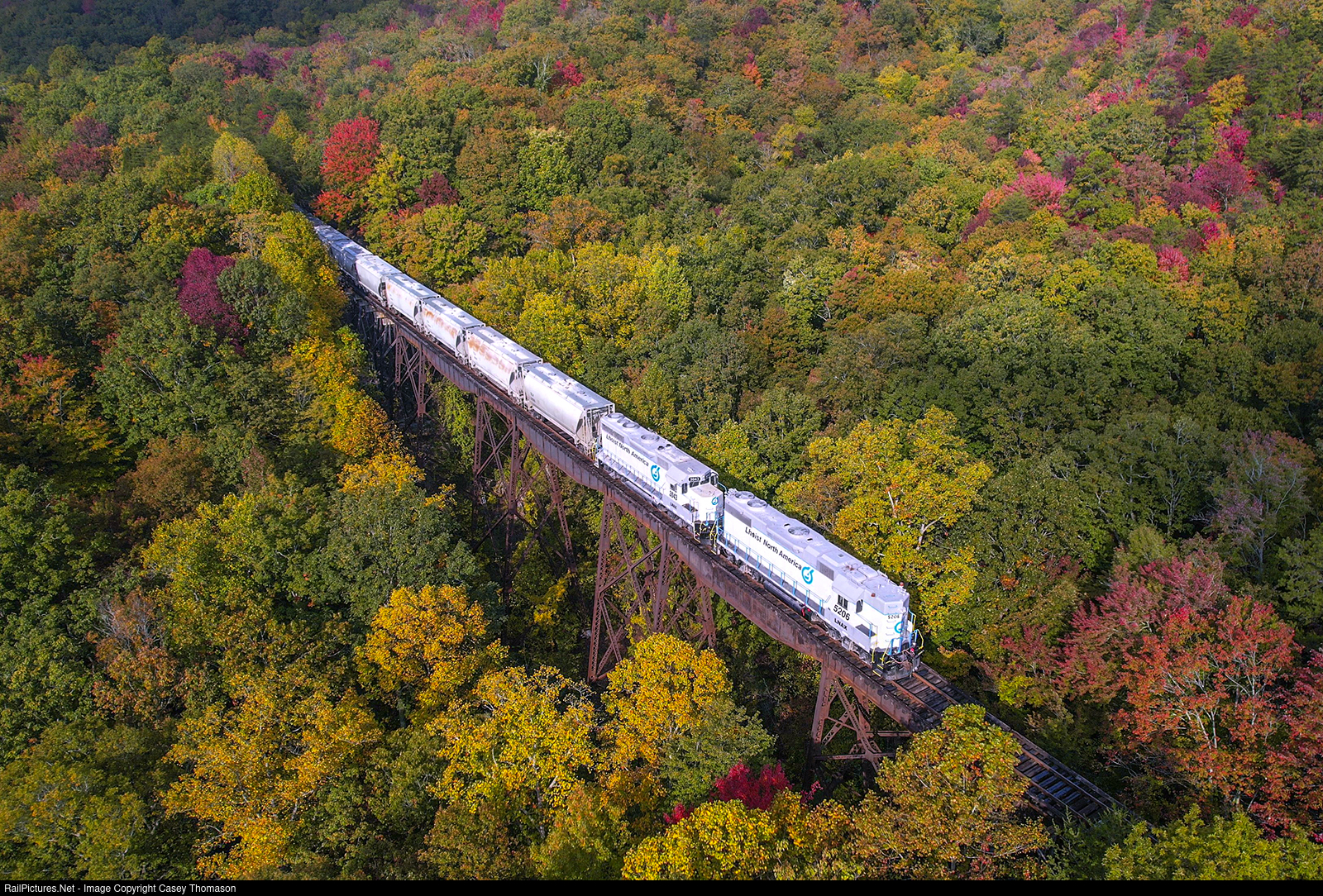 Former NS/Southern GP38-2 #5206 eases downgrade across Big Gulch Bridge along what is left of the Tennessee Central mainline, with Lhoist North America's train from Crab Orchard, bound for interchange with NS in Rockwood, a few miles ahead in the valley below.