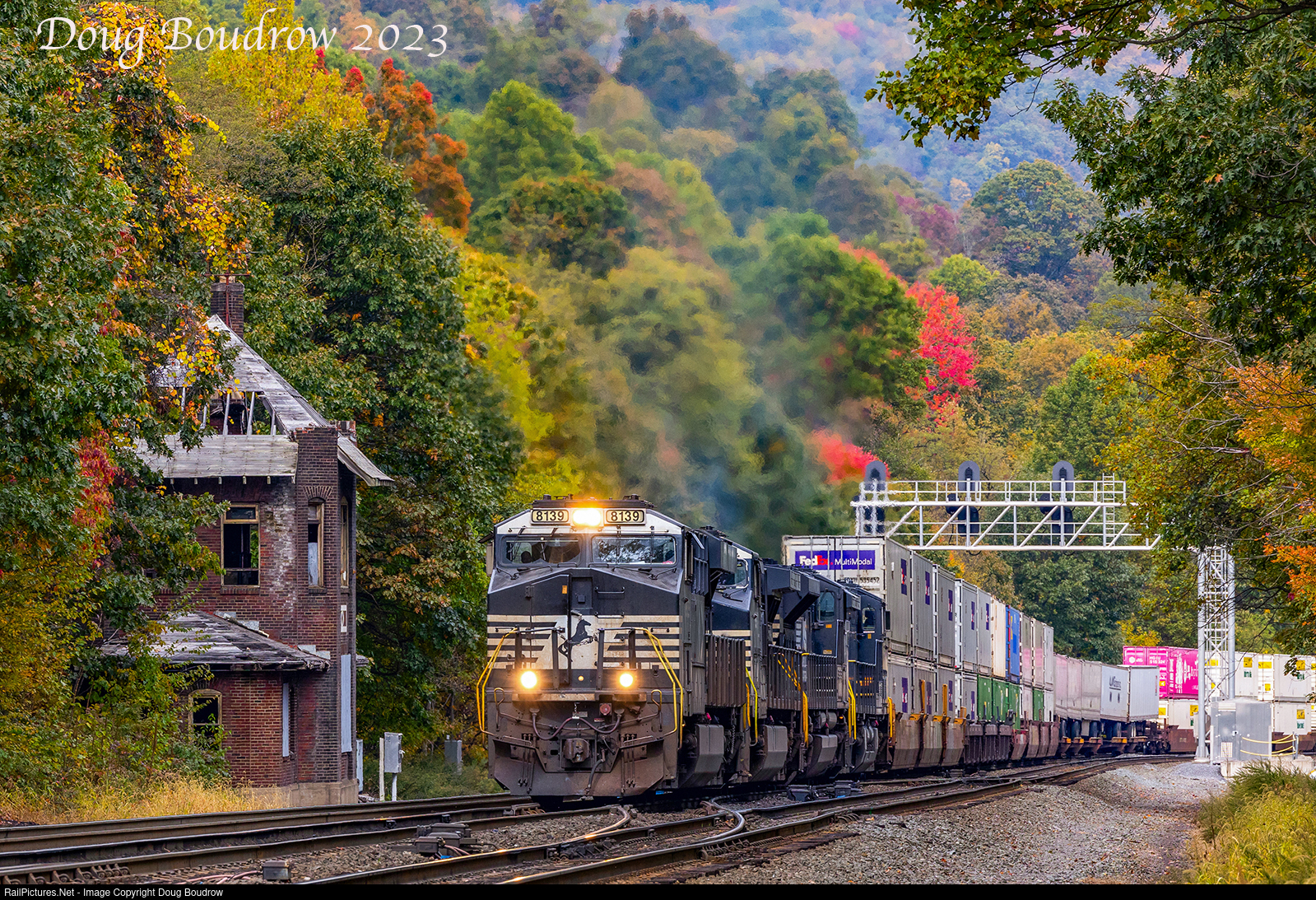 Norfolk Southern intermodal train 25G (Harrisburg, PA to 47th Street - Chicago) is seen passing MG tower as it grinds up the East Slope of the Alleghenies. The tower was built by the Pennsylvania Railroad in 1944 to control new crossovers that were installed at this location to help with increasing traffic during World War 2. MG stands for "mid-grade" as it is approximately halfway up the climb to the summit in Gallitzin. The tower survived through the Penn Central era and most of the Conrail era before closing in 1994. NS was using the structure to house electronics for the color position light signals that stood here, however, once those were removed the building fell into disrepair. The future fate of the tower is uncertain as NS solicited bids to demolish the structure in 2021 but has not yet followed through.