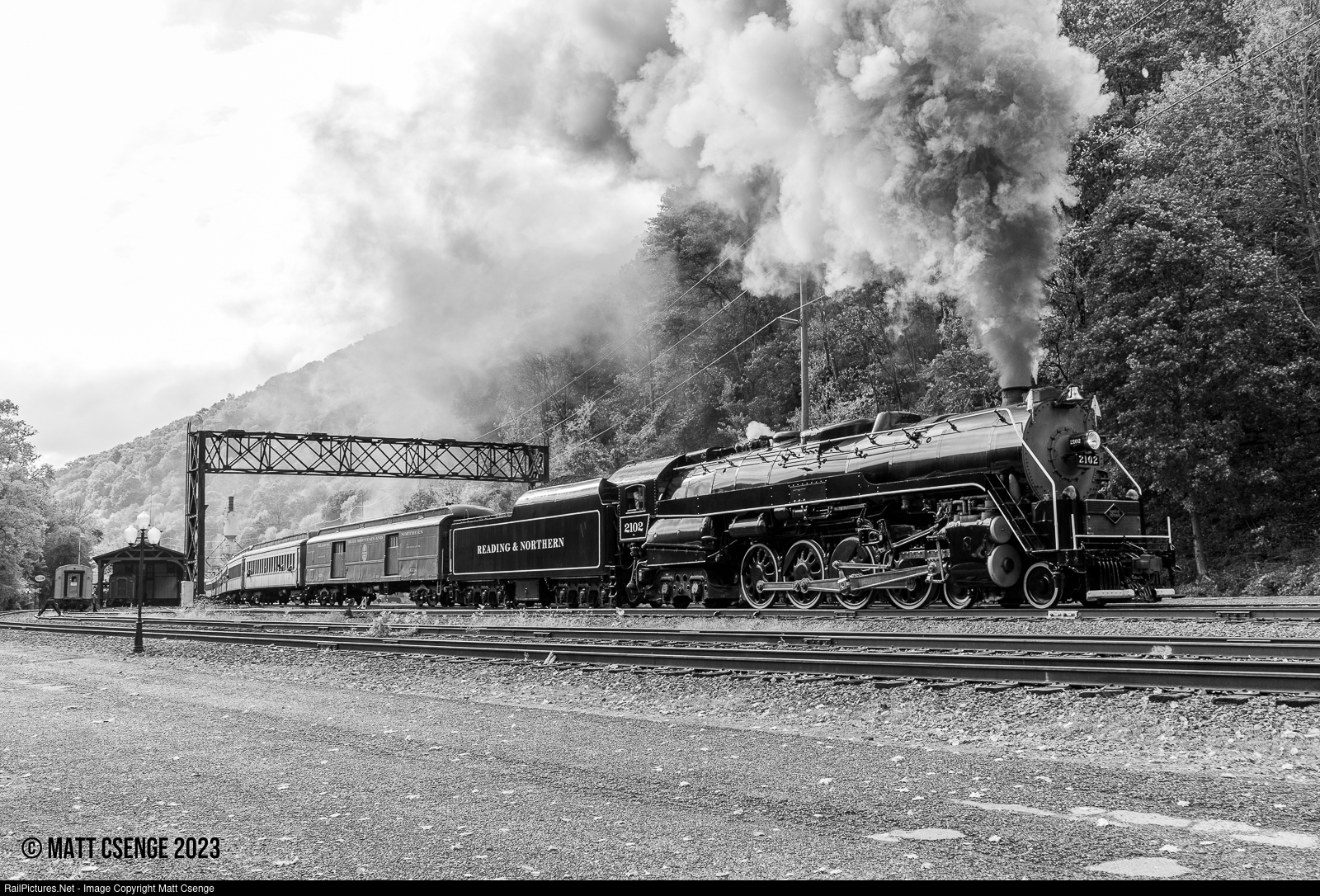 After making its first stop in Port Clinton, PA, Reading Blue Mountain & Northern T-1 no. 2102 is seen leaving the railroad's headquarters en-route to Jim Thorpe. |