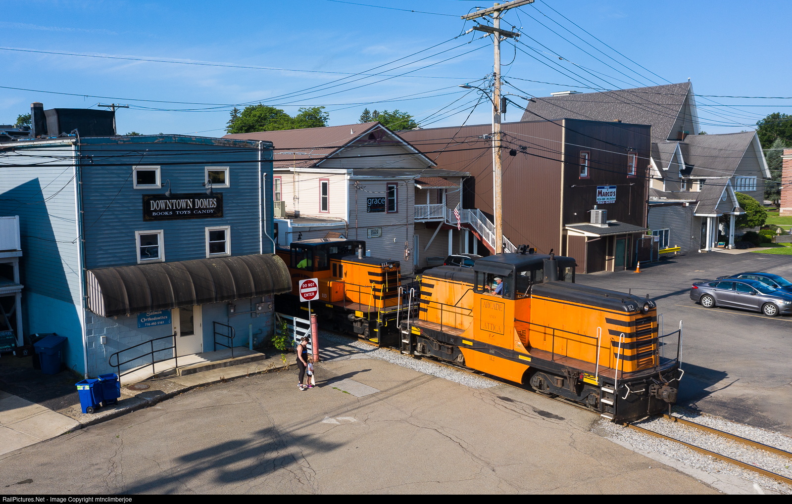 A pair of Arcade & Attica GE centercabs make a shove move south as they pass through the alley on the backside of Main Street in Arcade, New York. Once the crew has their train put together, they will depart north towards North Java.