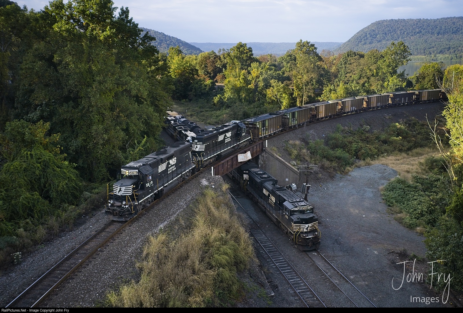 The fall colors have not yet found south east Pennsylvania as 2 trains wait to get into Enola yard while a ballast train comes across the Rockville bridge.