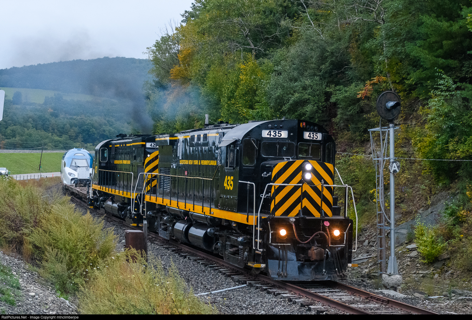 A pair of WNYP Alco's have started their journey west from Hornell to Olean with one of Amtrak's Avelia trainsets in tow from the Alstom Facility that is bound for storage. The train is climbing out of the Canisteo River Valley and passes by the old approach signal at Almond Lake, New York.