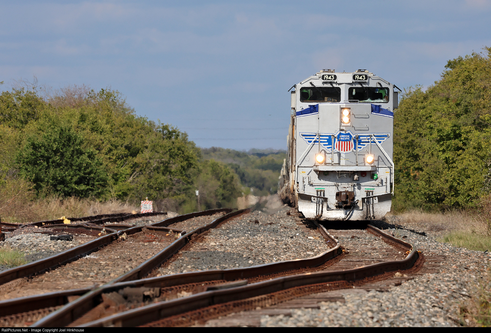 | UP 1943 - Spirit of Union Pacific holds the siding at Goodwin, north of New Braunfels, to change crews. The new crew checks the headlights (thus lights on ... or maybe they just did it for me). Waited as long as I could before my passenger got impatient to see what might pass UP 1943 from behind, but gave up ... then saw the other train pass in my rear view mirror!! |