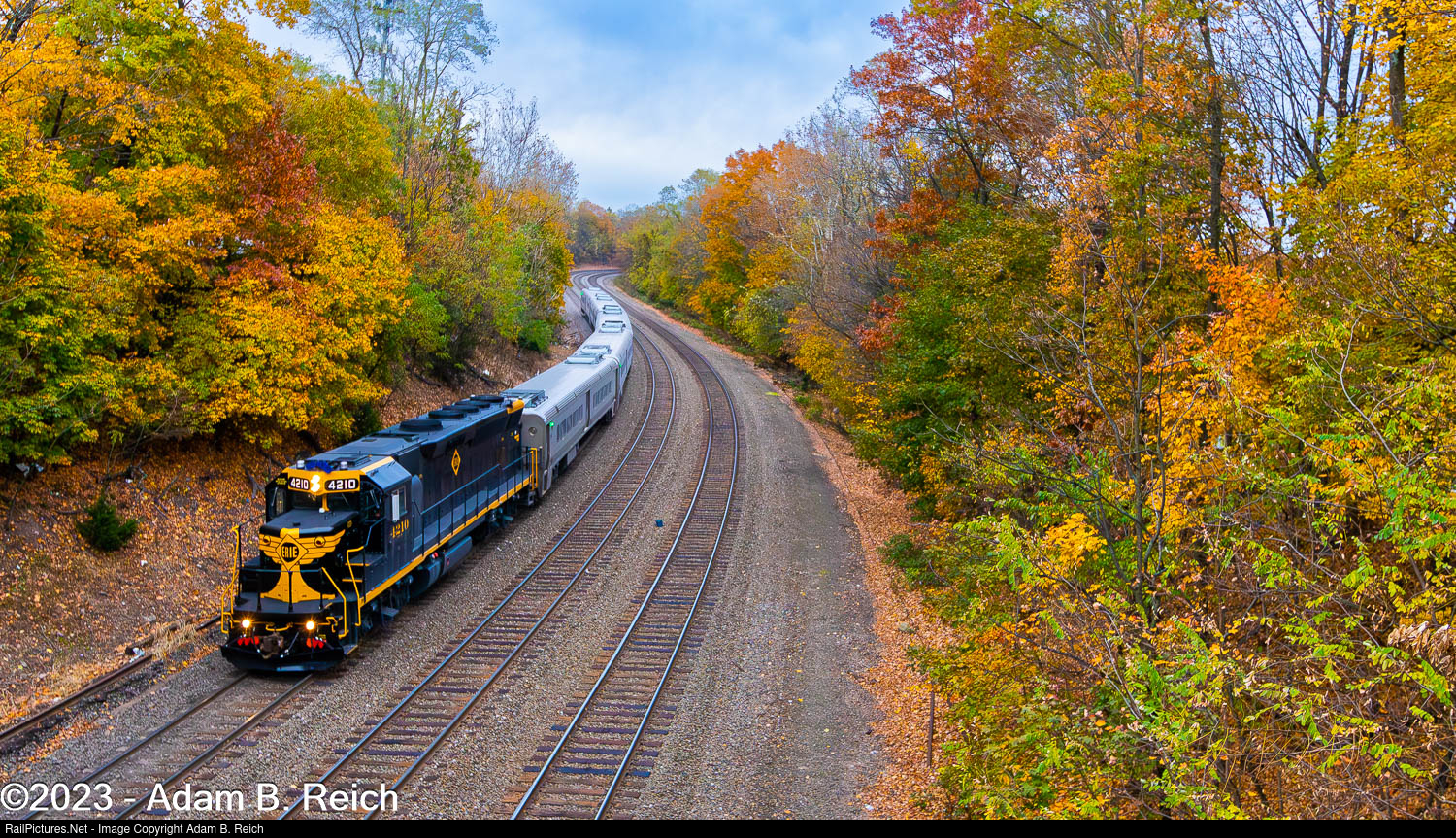 Erie Unit in Peak Color: NJ Transit's new Erie Railroad heritage unit rounds Collins Curve in Waldwick surrounded by colorful fall foliage during the morning rush.