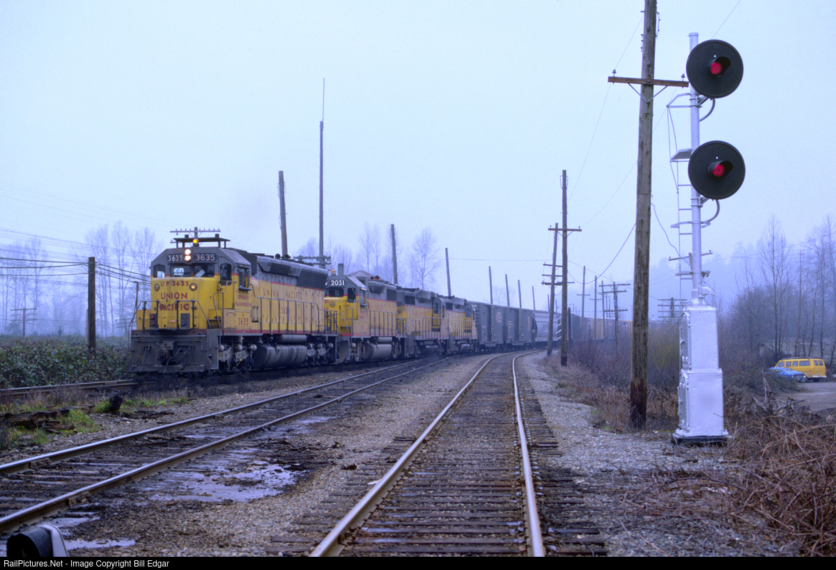 UP SD45 3635 and three 4 axle EMDs roll their freight across the Pacific Coast (Milwaukee Road) tracks at Black River Jct. south of Seattle as the train heads toward Tacoma and on to Portland, OR. Milwaukee's Tacoma mainline joins the UP here and joint trackage will be used to Tacoma where UP will then use BN (NP) Trackage rights to reach their own line in Portland, OR.