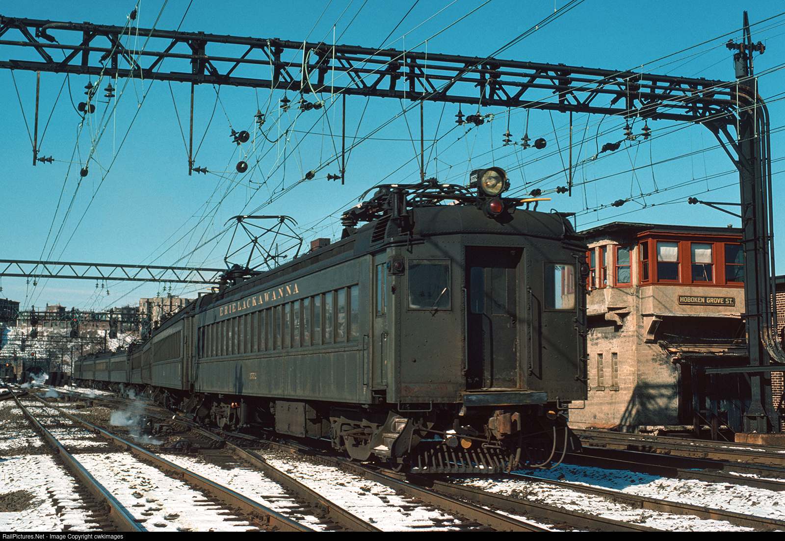 On a cold February day in 1977,8 EL MU's pass by Hoboken Grove Street Tower. The the left, another set of EL MU's comes out of the tunnels. Photograph by Jim Marcus, from the collection of Colin Kund.